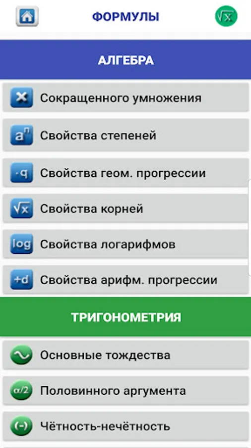 The application “Mathematics of VNO” in Russian will be useful for high school students during preparation for exams and passing tests of VNO in mathematics and teachers of mathematics and physics in school.