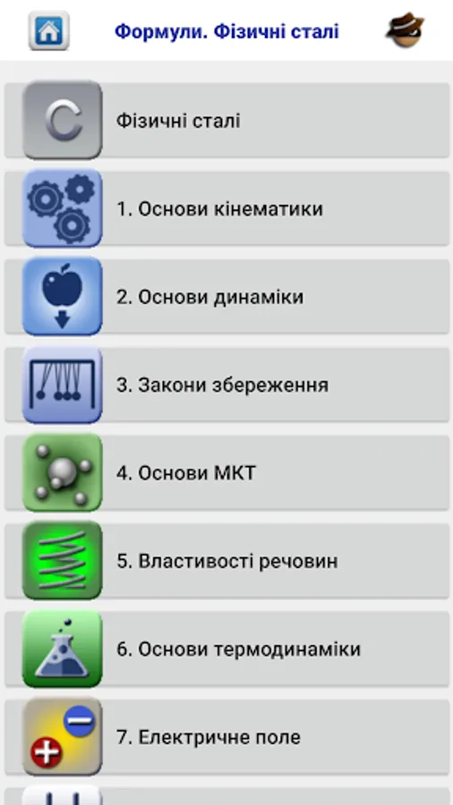 In addition "Physics" tests included testing the physics of years and a trial test with the answers. It is nearly 650 problems in physics. You can use natural formulas, basic concepts of physics and constants.