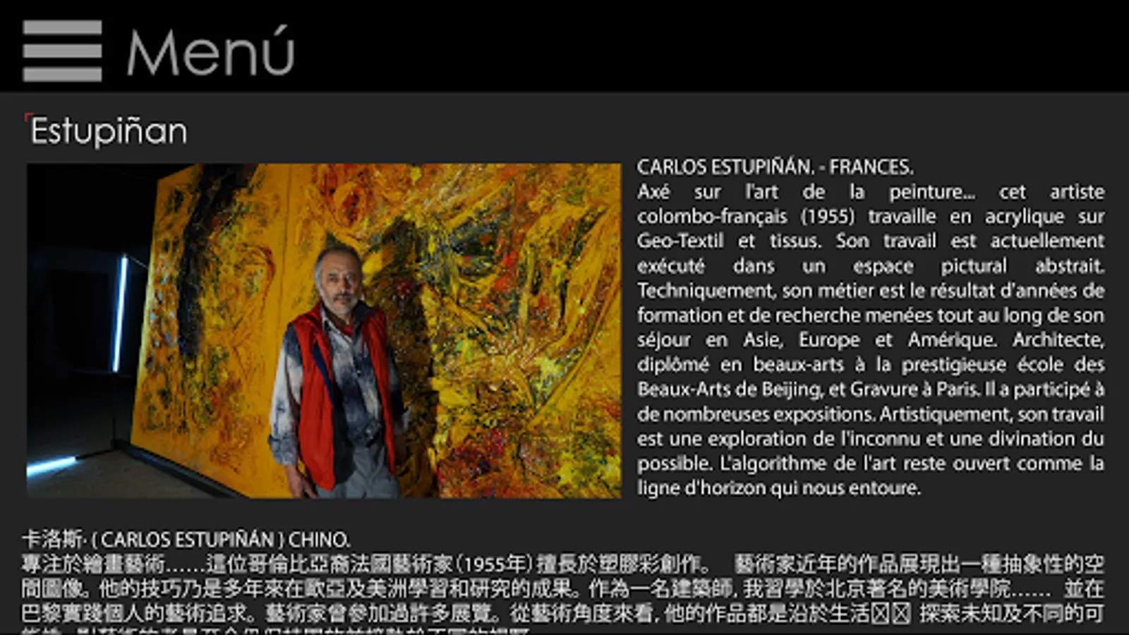 Focused on the art of painting ... this Colombian-French artist (1955) works acrylics on Geo-Textil and canvas. His work currently runs in an abstract pictorial space. Technically his craft is the result of years of training studies and research carried out throughout his experience in Asia, Europe and America. An Architect, studied fine arts at the prestigious school of fine arts in Beijing and etching in Paris. He has participated in numerous exhibitions. Artistically, his work is an exploration of the unknown and a divination of the possible. The Algorithm of art remains open as the line of the horizon around us.