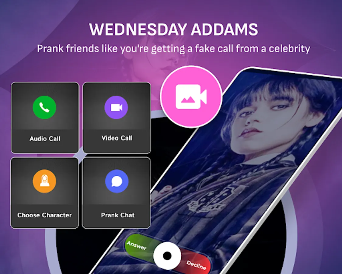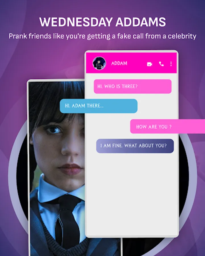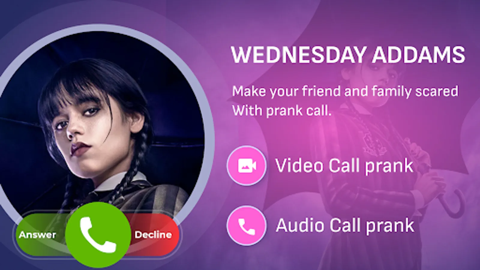 This totally free fake calling app to enjoy and set prank calls with the Wednesday Addams prank call app. Prank calling simulator to surprise your friends that you are actually talking to Jenna Ortega famous TV actress. So, download Wednesday fake call with Adams family calling to enjoy the prank with funny call.