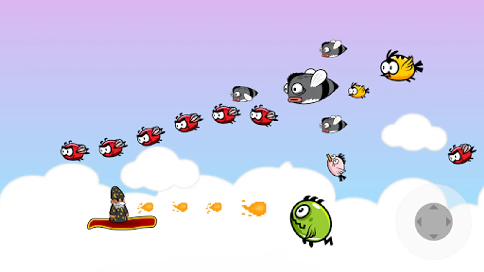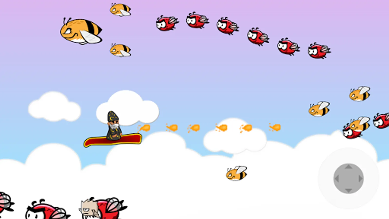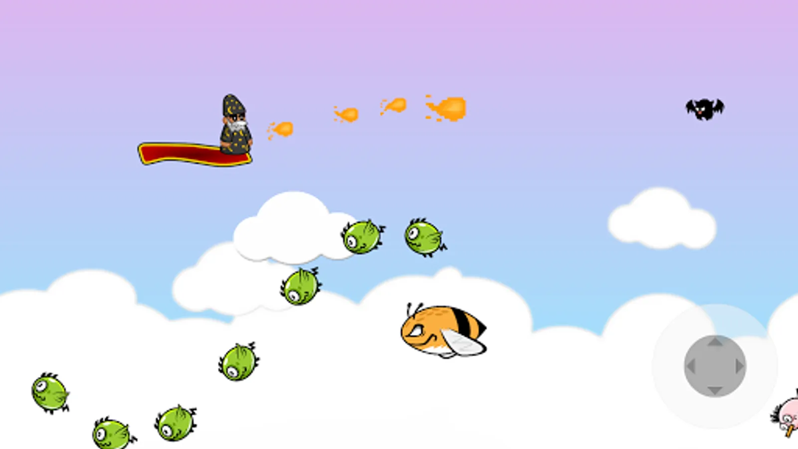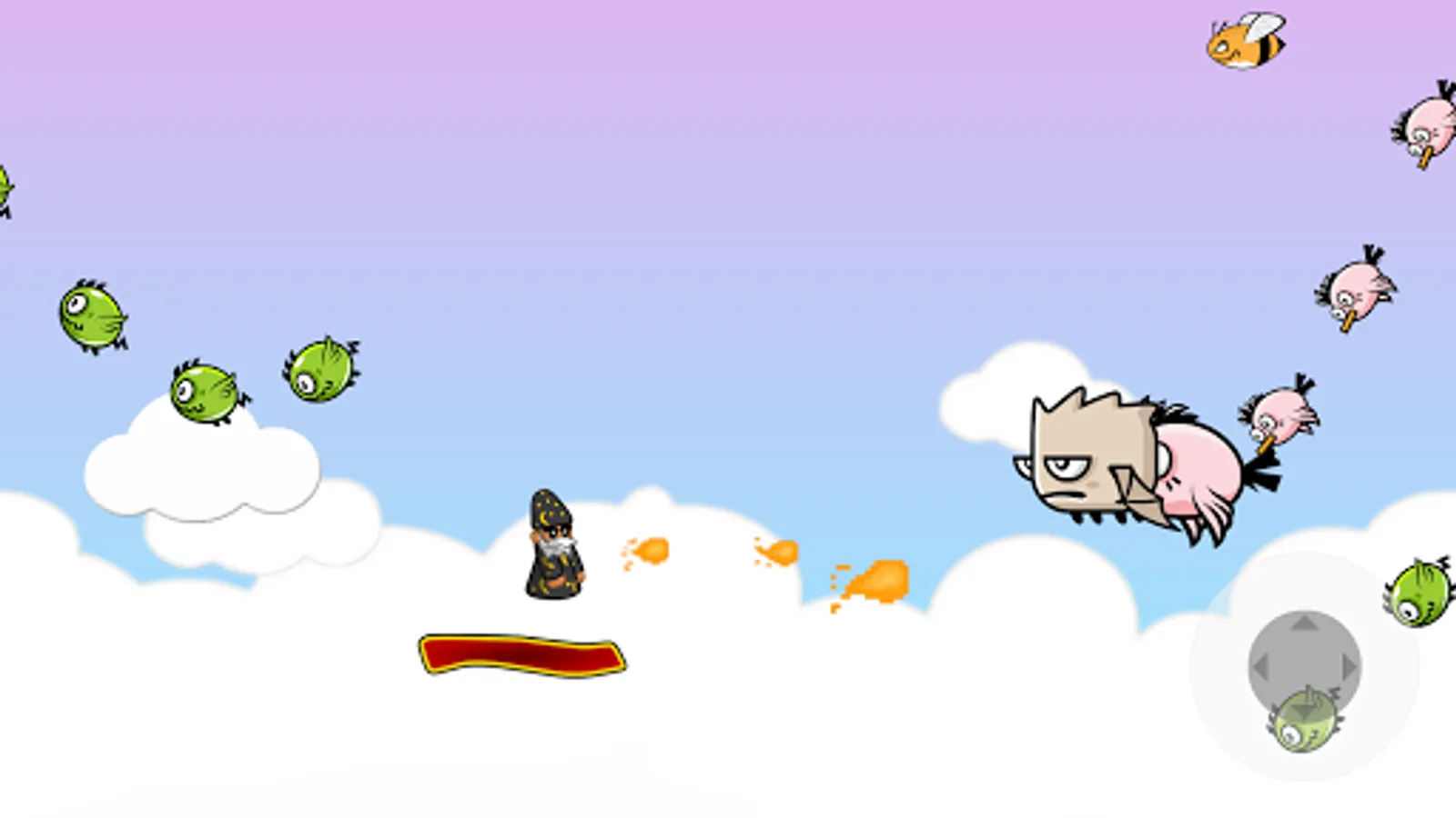 HOW TO PLAY: Use the pad placed at bottom-right for moving the carpet. Keep in mind that your avatar can fall down, try to keep him in the middle. You can drop many small fireballs, or charge for 2 seconds and drop a bigger fireball.