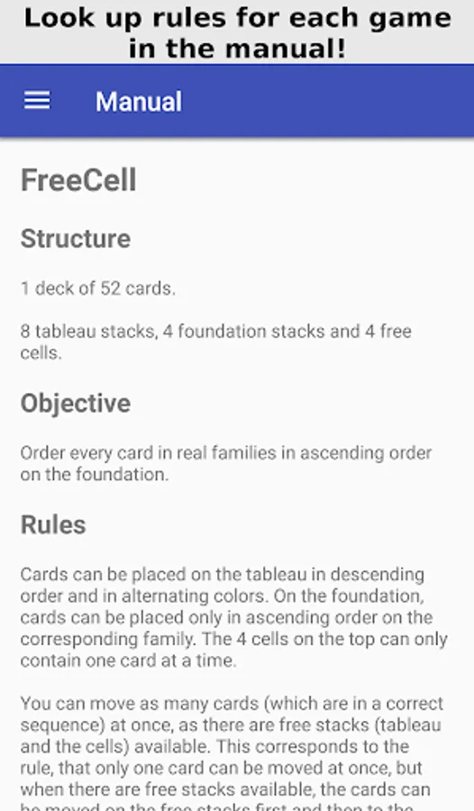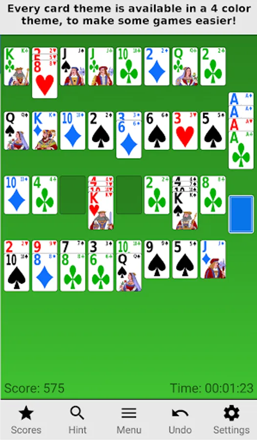 The goal of Addiction Solitaire is to arrange all of the cards in sequential order from A to 6 in the same suit. One card can fill a blank position but it needs to be greater in value and the same suit as the card found to it’s left.