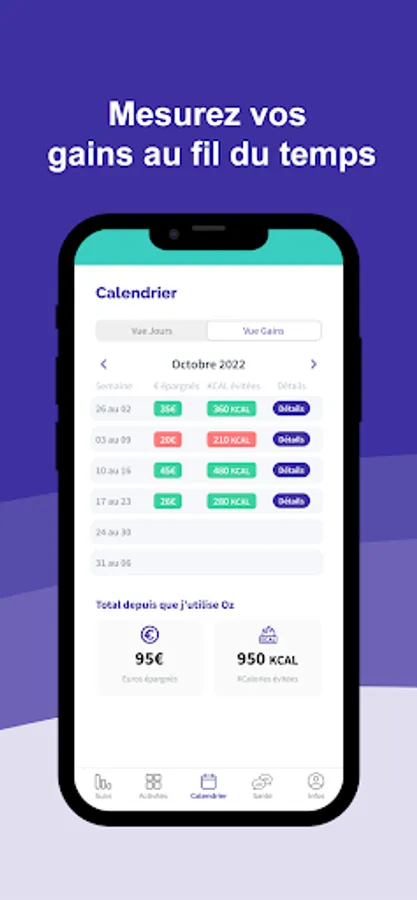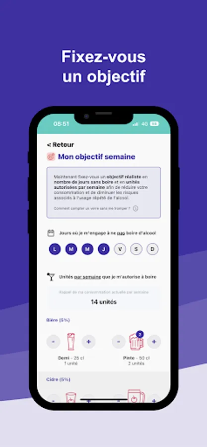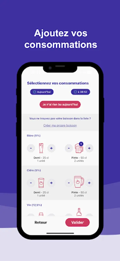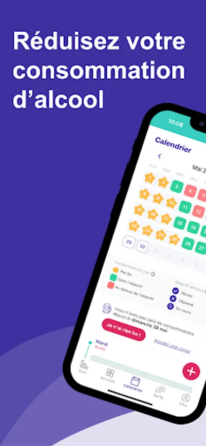 The application allows you to set goals and track your reduction in alcohol consumption thanks to a consumption diary. Over time, also discover your savings in euros and the calories avoided.