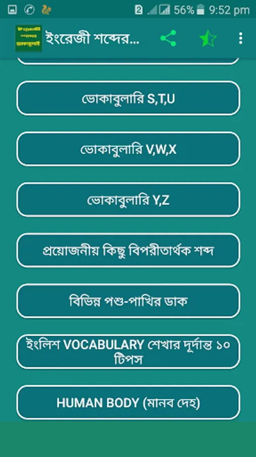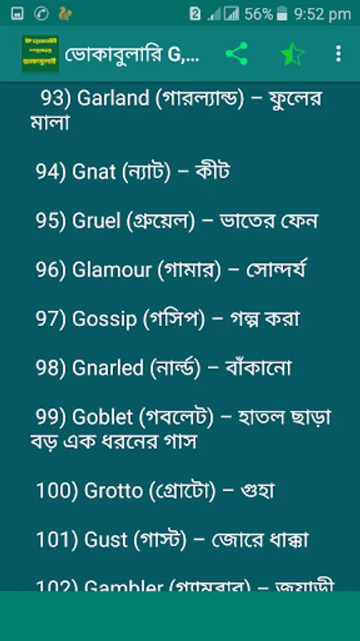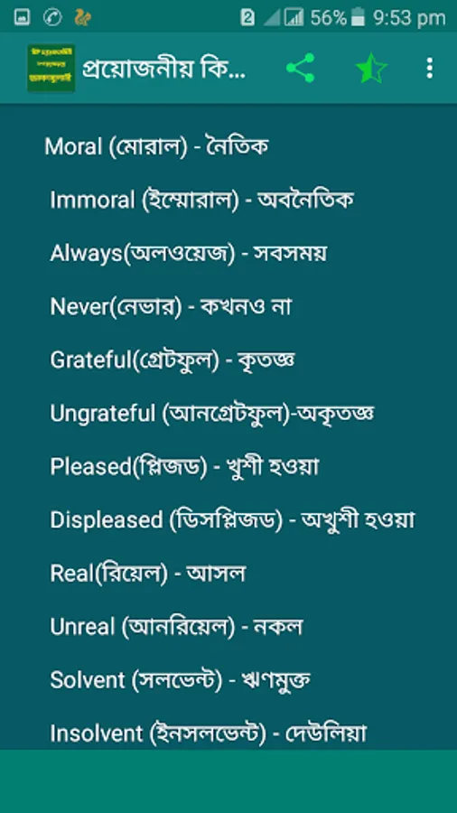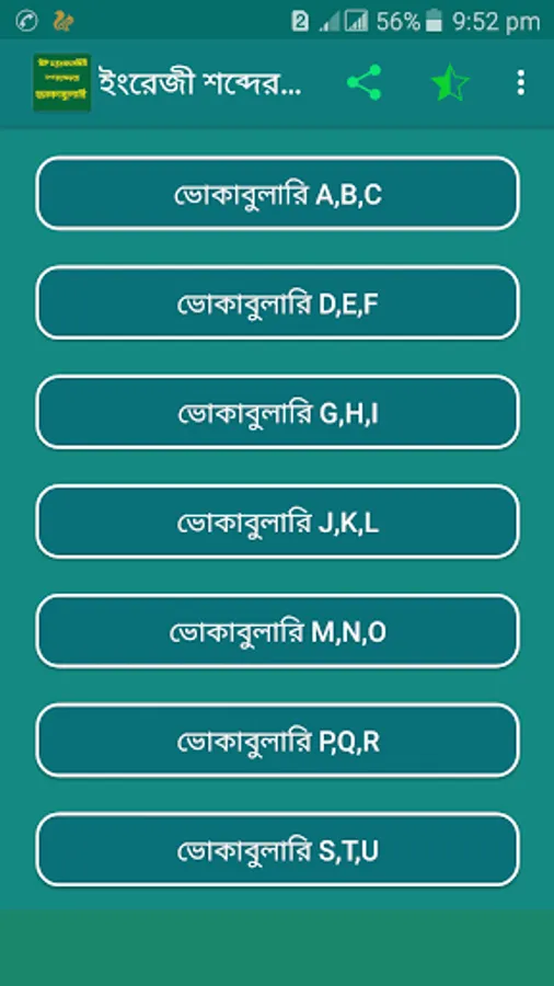 ইংরেজি ভোকাবুলারি (english vocabulary) অ্যাপ এতে রয়েছে অর্থসহ ইংরেজি শব্দ বাংলা উচ্চারন। english vocabulary Bangla app is really helpful who wants to improve their knowledge in vocabulary building. This english vocabulary learning app is specially designed for whom those are really interested to english speaking course in bangla. No matter how old you are or how talent you are just download our app and start english learning in bangla. We try to cover the most common vocabulary english to bangla / words to that you can easily translate any words in english to bangla and bangla to english. It's like a wordbook english to bangla. There are many spoken english to bangla app in the marketplace but this is one of the best english speaking course in bangla. We often notice that when someone start conversation sometimes they are not feeling comfortable because they are not enriched with english vocabulary bangla. If you are master of that particular thing then spoken english to bangla will be a fun for you. You can talk with anybody easily. Though english grammar bangla is not important for communication english but we need to follow few rules english grammar. It helps to develop your sentence structure. We recommend you to download our english to bangla translation apps which we released earlier in our store along with english speaking course in bangla which is also available in your store by the name of ইংরেজীতে কথা বলার সহজ ফর্মুলা . so why you are waiting for start downloading our english vocabulary bangla app and start learning and speaking english . if you have this app then you don’t need to download english to bangla dictionary app.