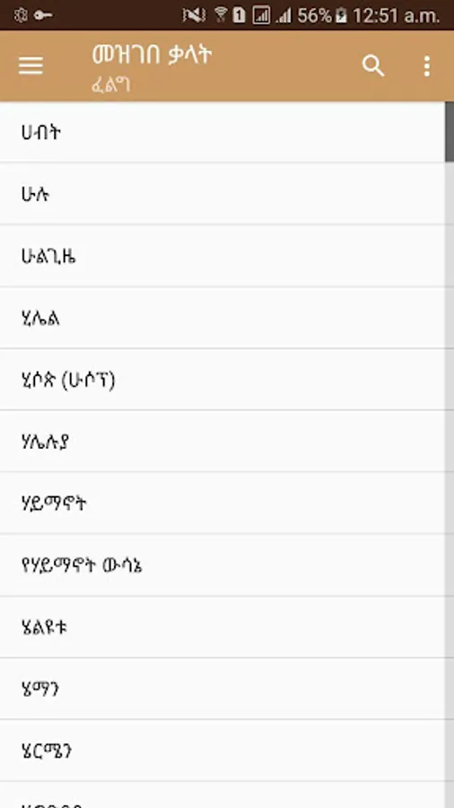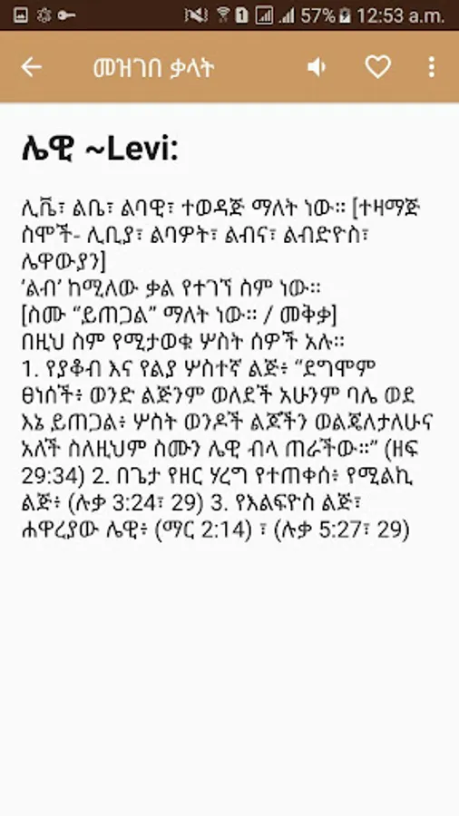 Amharic Bible Dictionary is an application that contains more than 1000 Biblical words and Biblical names with their meaning.