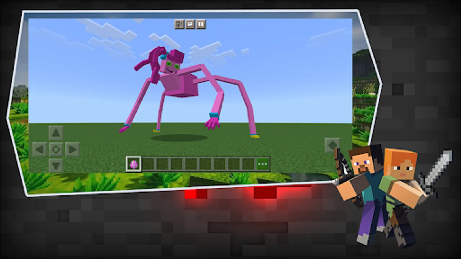 Mommy Long Legs from Poppy Playtime 2 mod for MCPE contains a free pack of addons for Minecraft (PE, Bedrock Edition) that adds horrible Huggy Wuggies and a few revived dolls from the factory to the game.