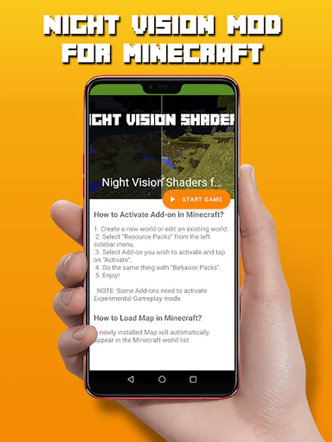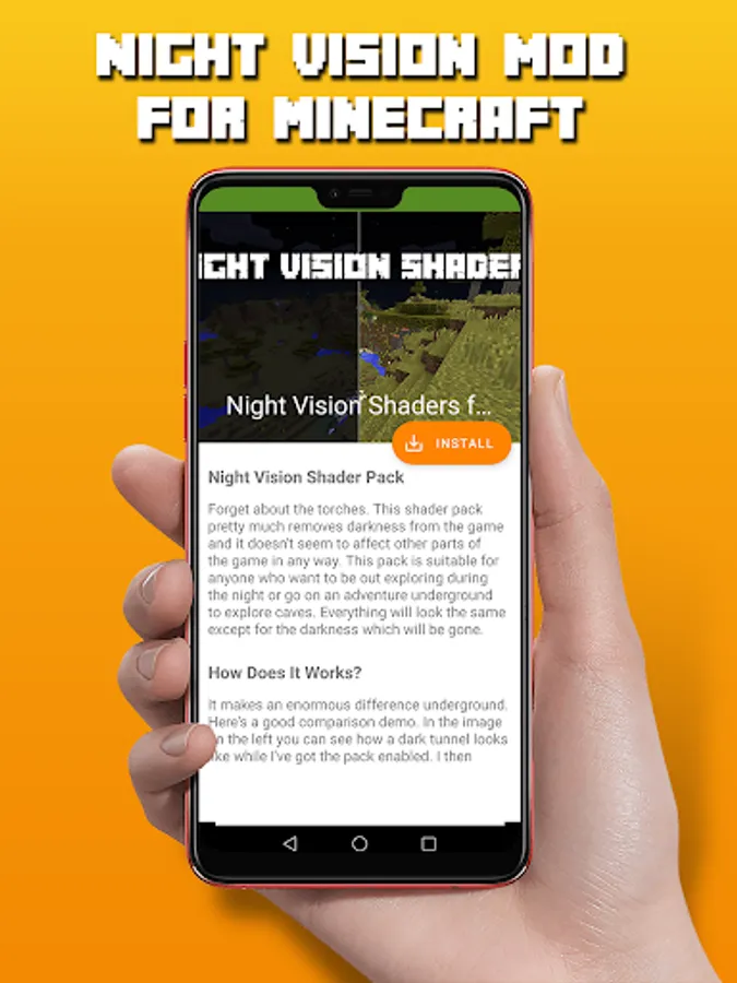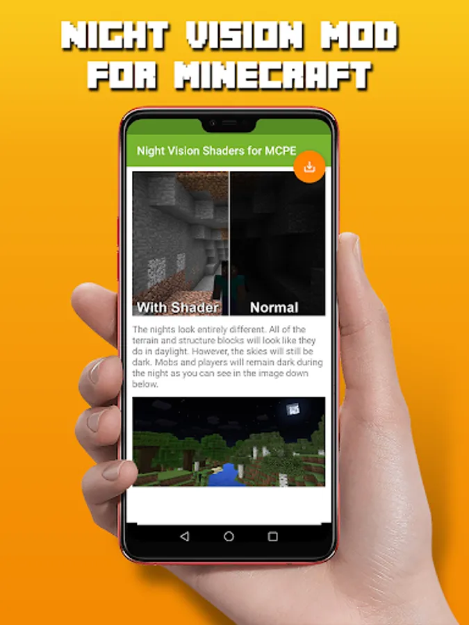 Night Vision Mod for Minecraft PE is an application that help you install Night Vision Shader Pack into your Minecraft Bedrock Edition! With this Night Vision Shader Pack, darkness will be remove from your Minecraft world! It's best for exploring during the night or adventure in underground caves. That sound interesting, isn't it?
