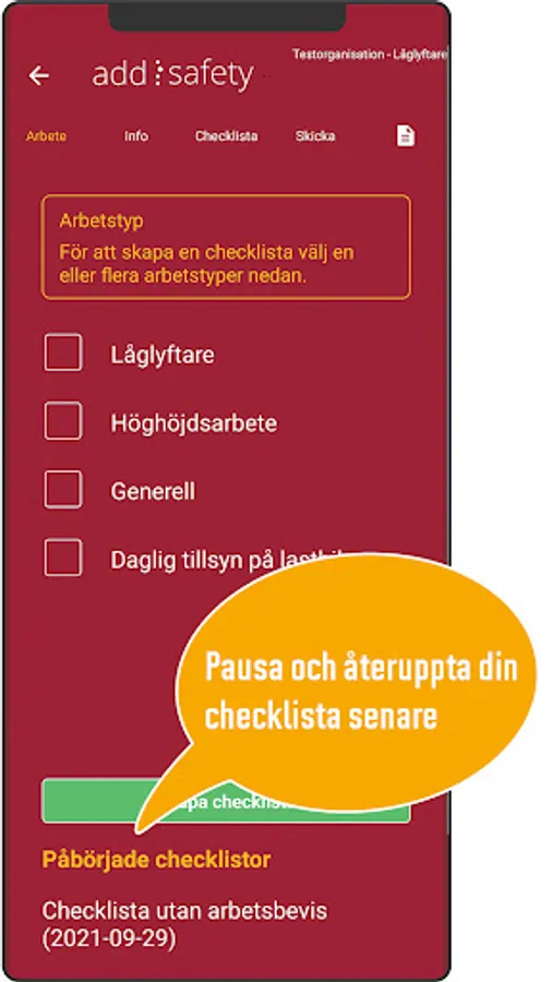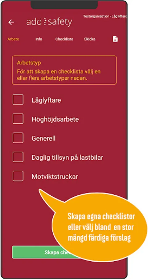 With Add safety, you get a dynamic and flexible tool for checklists for risk assessments, safety rounds, inspections and daily supervision. Create your own checklists or choose from the proposals based on your business.