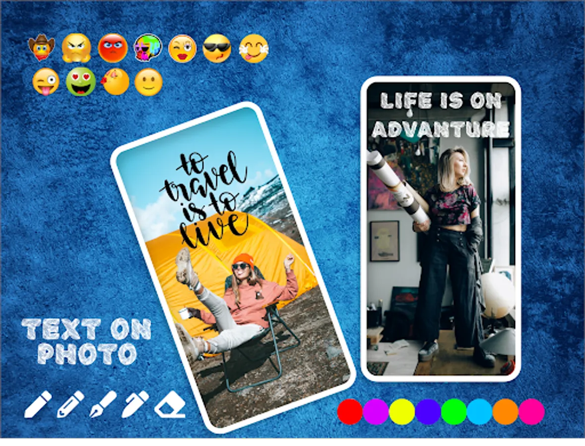 Text on Photo is a smart Text Photo editor to add Add Text to Photo Projects, Collages, and Designs. This free Text on Image Editor App has all the features you need for adding text to photos. This Text on Photo features an excellent Text Editor that makes it easy to add text to your images!