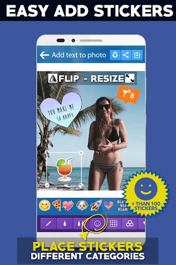 - Add stickers to photos (+100 stickers ready to use) add as many stickers as you want