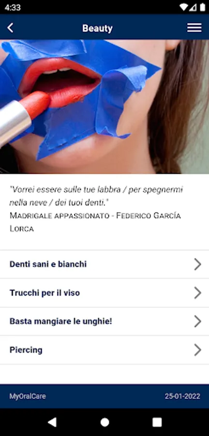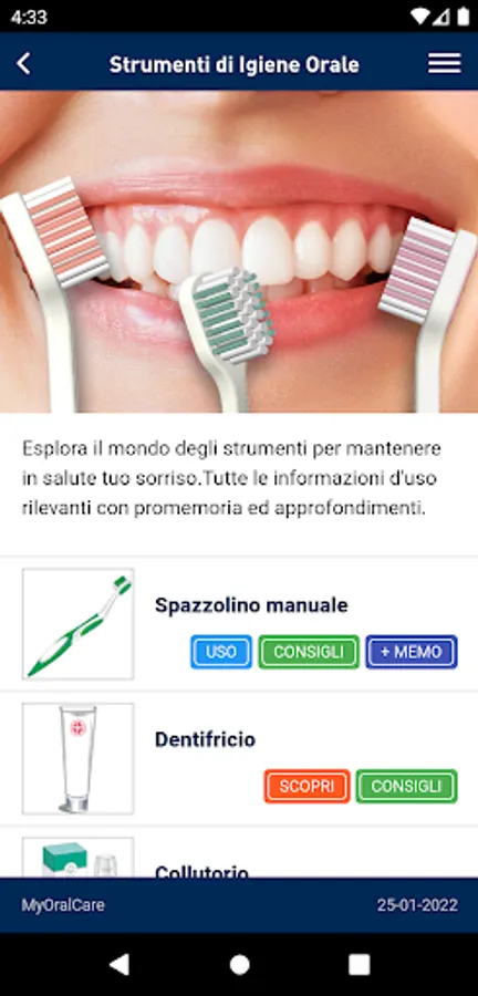 The dedicated and free application is designed to disseminate useful content for the protection of oral health through interactive awareness methods. "MyOralCare" exposes advice, insights and structured notions derived from the concrete, daily experience of Dental Hygienists.