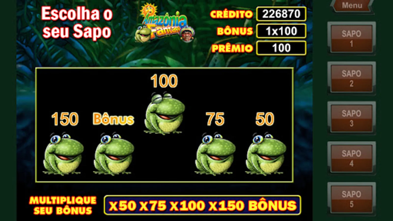 . Amazonia Fantasy (Froggy) boasting all its bonuses (Little Sun, Dice, Jaguar, and Roulette Show Ball and Senate);