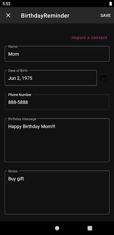 Get reminded of your saved birthdays and have text messages pre filled to send to your family and friends with the push of a button!