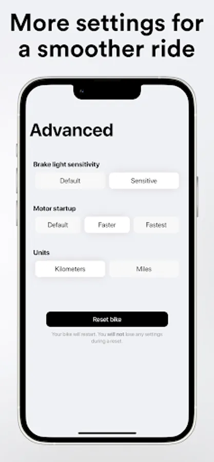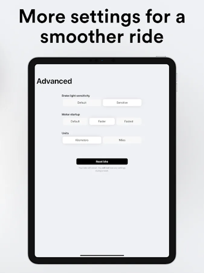 This app makes certain features of the bike accessible which may be illegal to use in certain jurisdictions. It’s the rider’s responsibility to ensure compliance with all applicable laws and regulations.