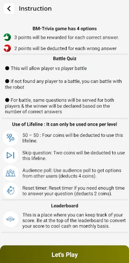 * Player Vs Player Battle (Battle Quiz)- you can connect with an opponent with either Facebook or Google and see who wins the competition.
