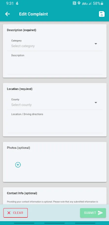 - Contact information, optional. Complaints can be made anonymously; HOWEVER, if you would like an email confirmation, you must provide a valid email address in the Contact Information screen.