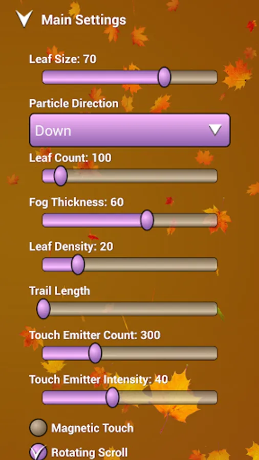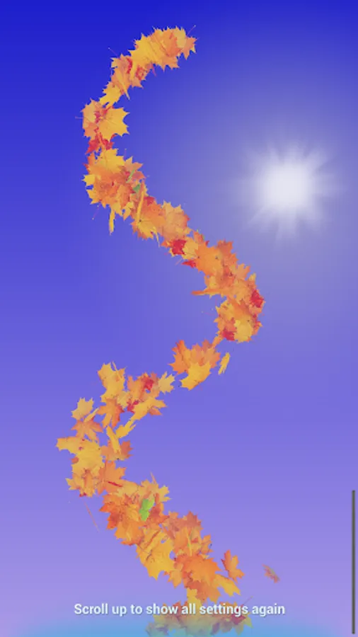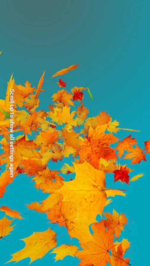 Falling maple and birch leaves in orange and yellow autumn colors. Touch to emit new leaves. Change direction of leaves, customize colors, physics etc. You can also use the "sky" background combined with real time mode, and gps to determine sunrise and sunset for your location. The wallpaper will show the sky, sun, moon etc according to your local time.