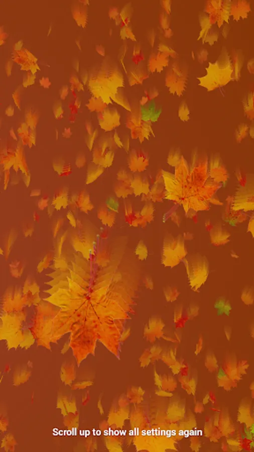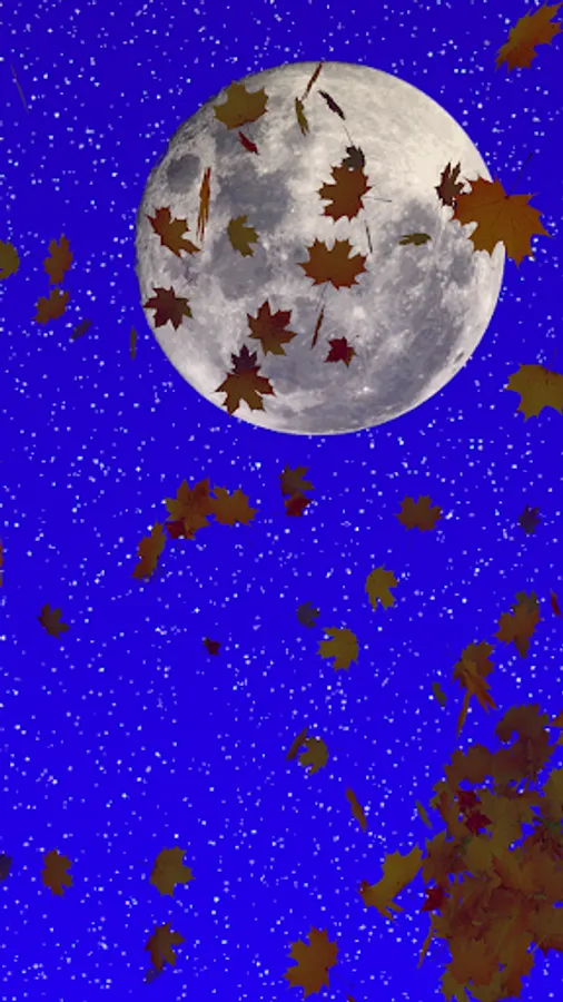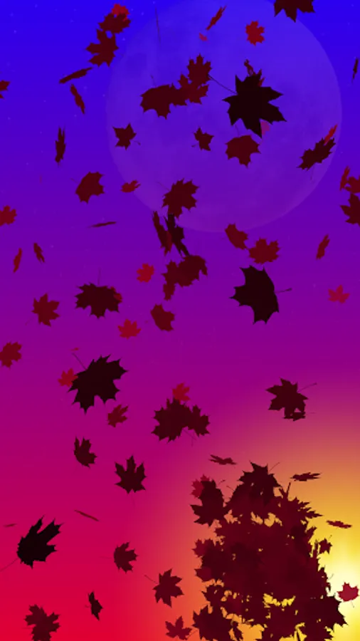 Falling maple and birch leaves in orange and yellow autumn colors. Touch to emit new leaves. Change direction of leaves, customize colors, physics etc. You can also use the "sky" background combined with real time mode, and gps to determine sunrise and sunset for your location. The wallpaper will show the sky, sun, moon etc according to your local time.