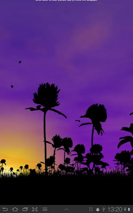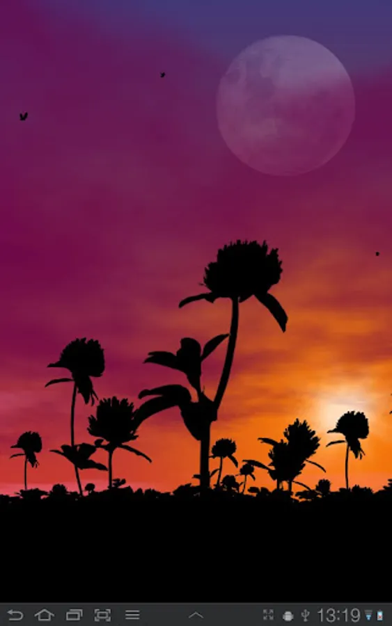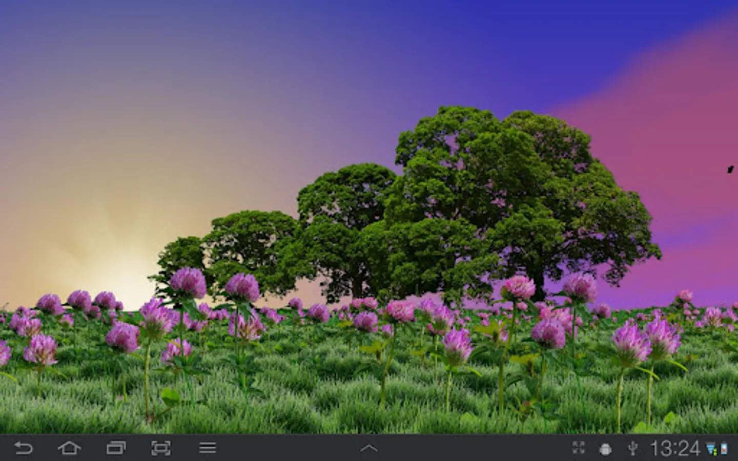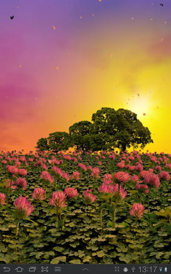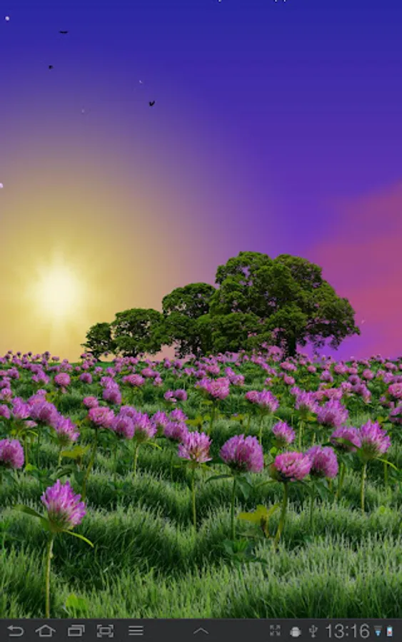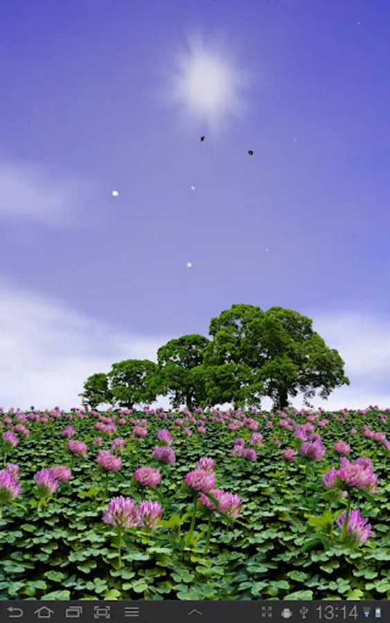 This live wallpaper features a Red clover field under a live sky with flying birds, moving clouds, sun, moon and stars (including shooting stars and twinkling stars).