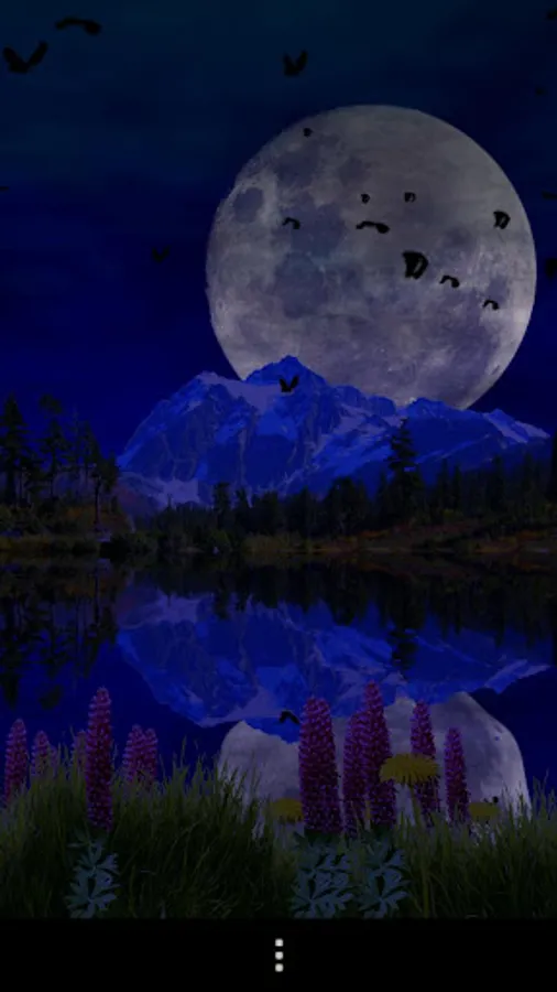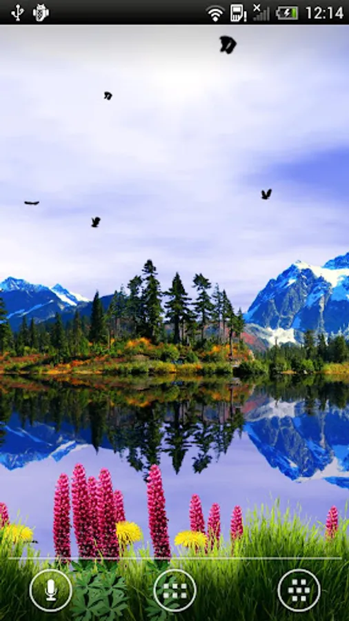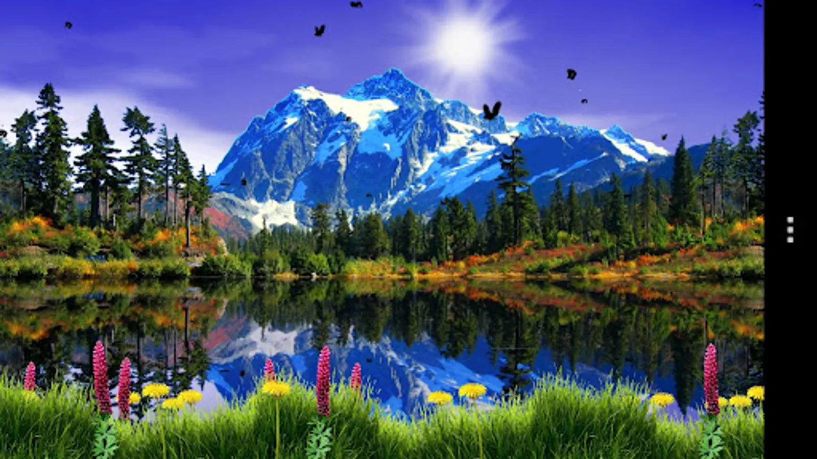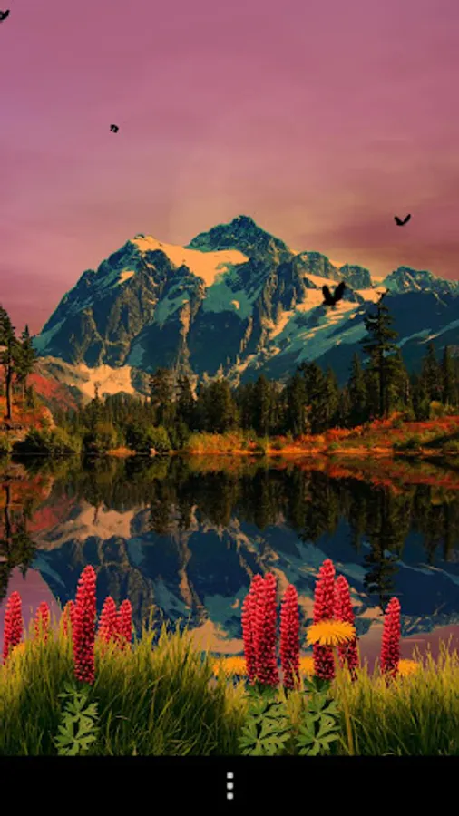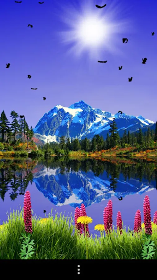 Breathtaking mountains reflecting in the calm relaxing waves of the lake. Flowers and grass in the foreground, birds in the air and a live sky with clouds, sun and moon depending on the time. Supports horizontal scrolling on all devices.