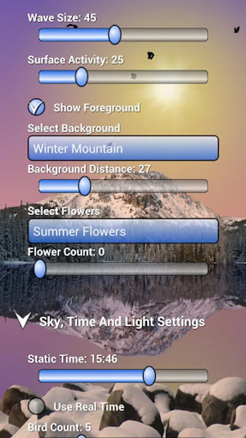 + Settings for image quality, stars, sun, sunset, sunrise, moon, night sky brightness, night light intensity, time, clouds, wind speed, birds, bird hunt, performance, color depth, scroll speed and more...