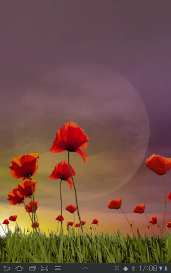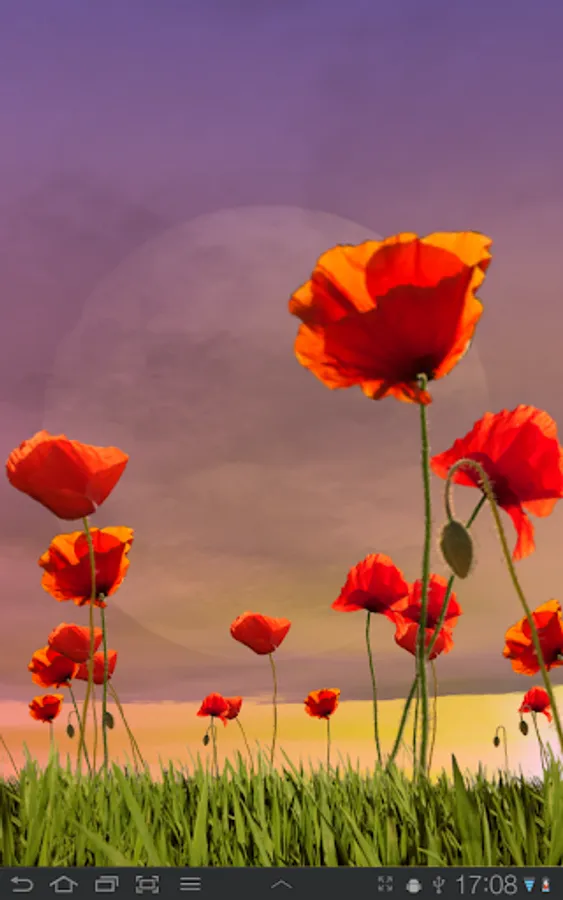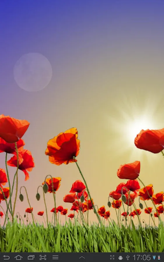 A field with red poppies swaying in the wind while clouds move over the sky that shifts color dynamically during the day and night. At dawn the sun rises and moves slowly over the sky until sunset around 6 pm. Or set the sunrise and sunset times to any time you like. As the night falls the moon appears clearer and clearer until fully visible at midnight.