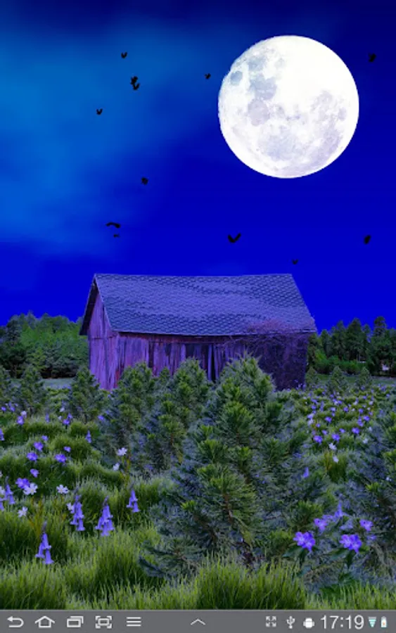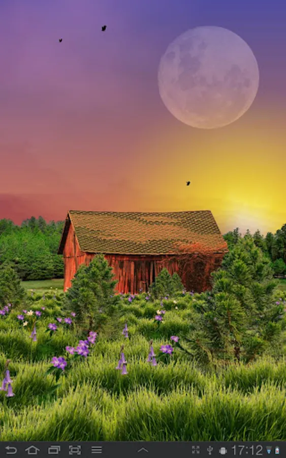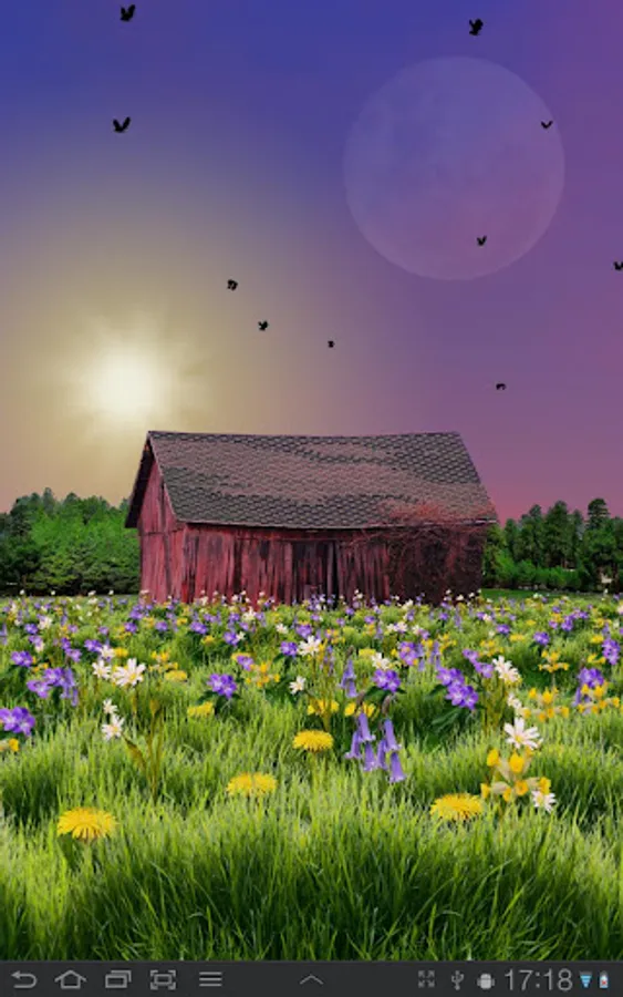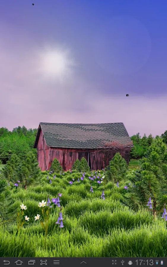 A red barn surrounded by flowers and trees. Sky is dynamic and changes colors and appearance for every second of the day. Horizontal scrolling supported on all devices.