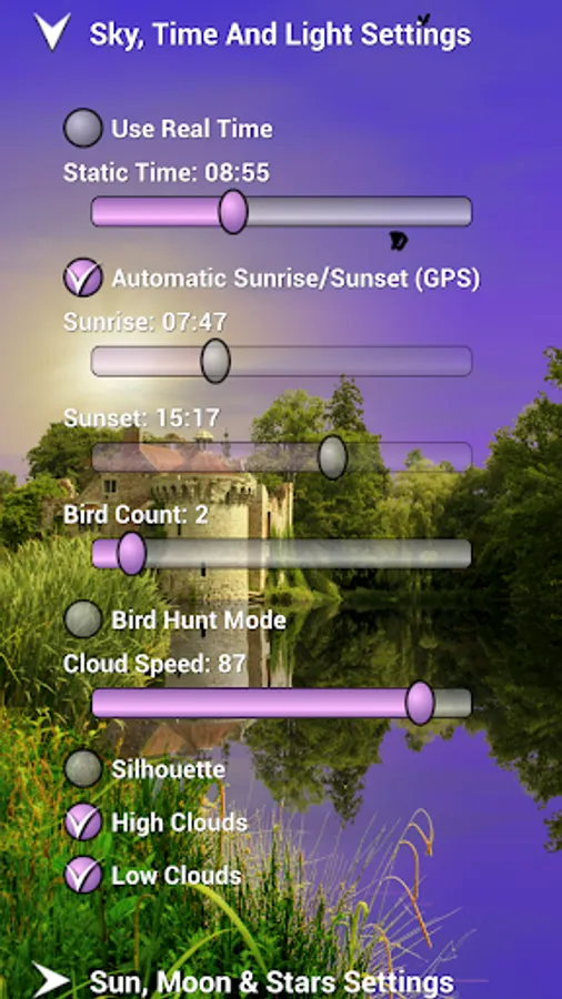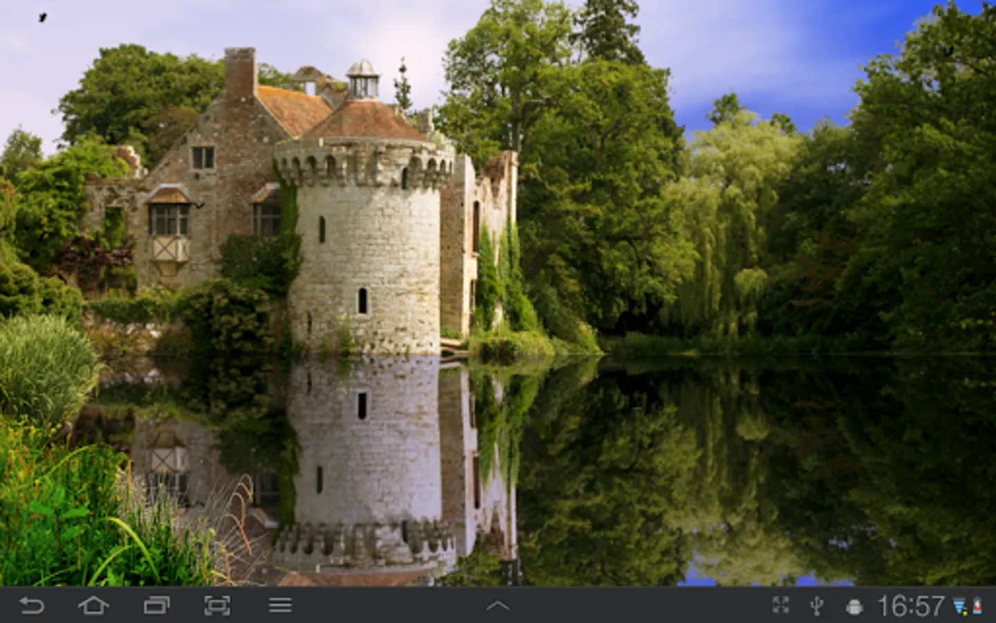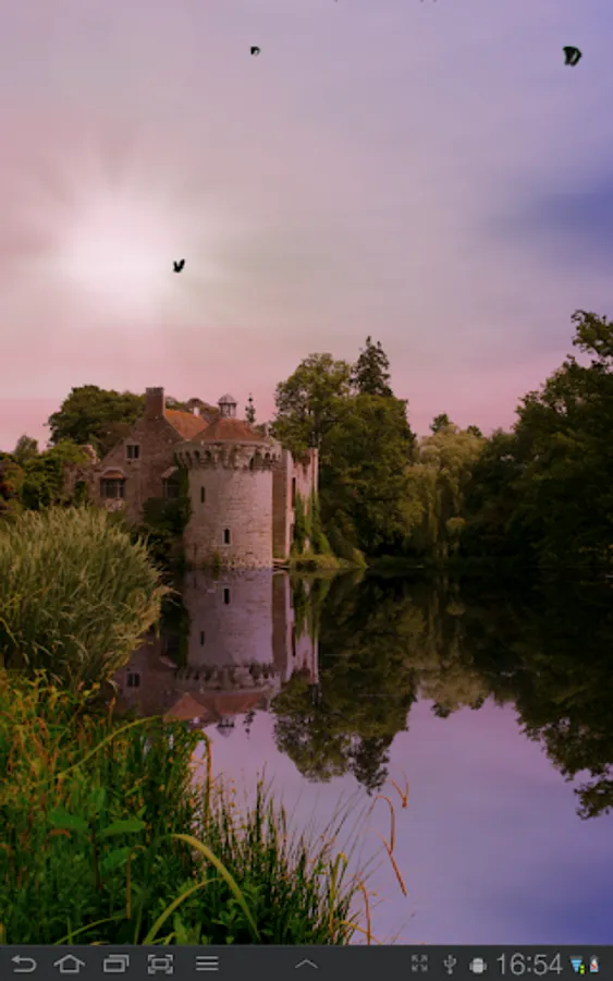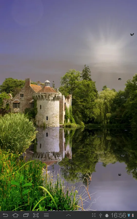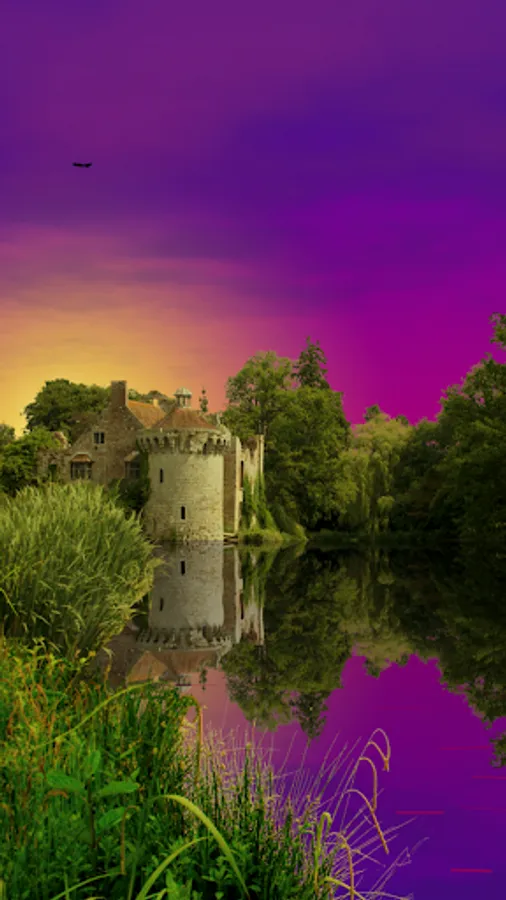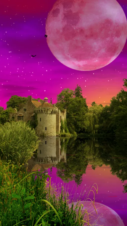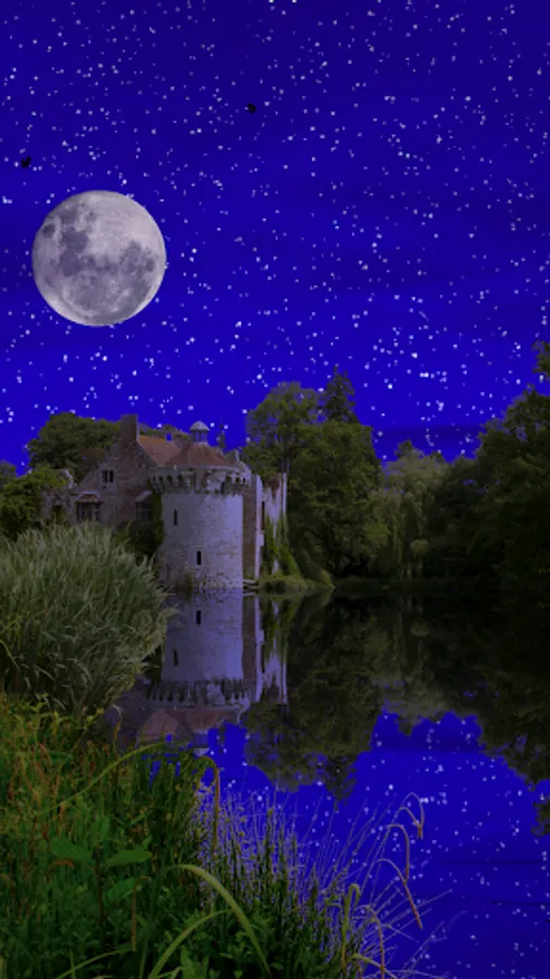Medieval castle reflecting in a pond with calm relaxing waves and a live 24 hour sky.