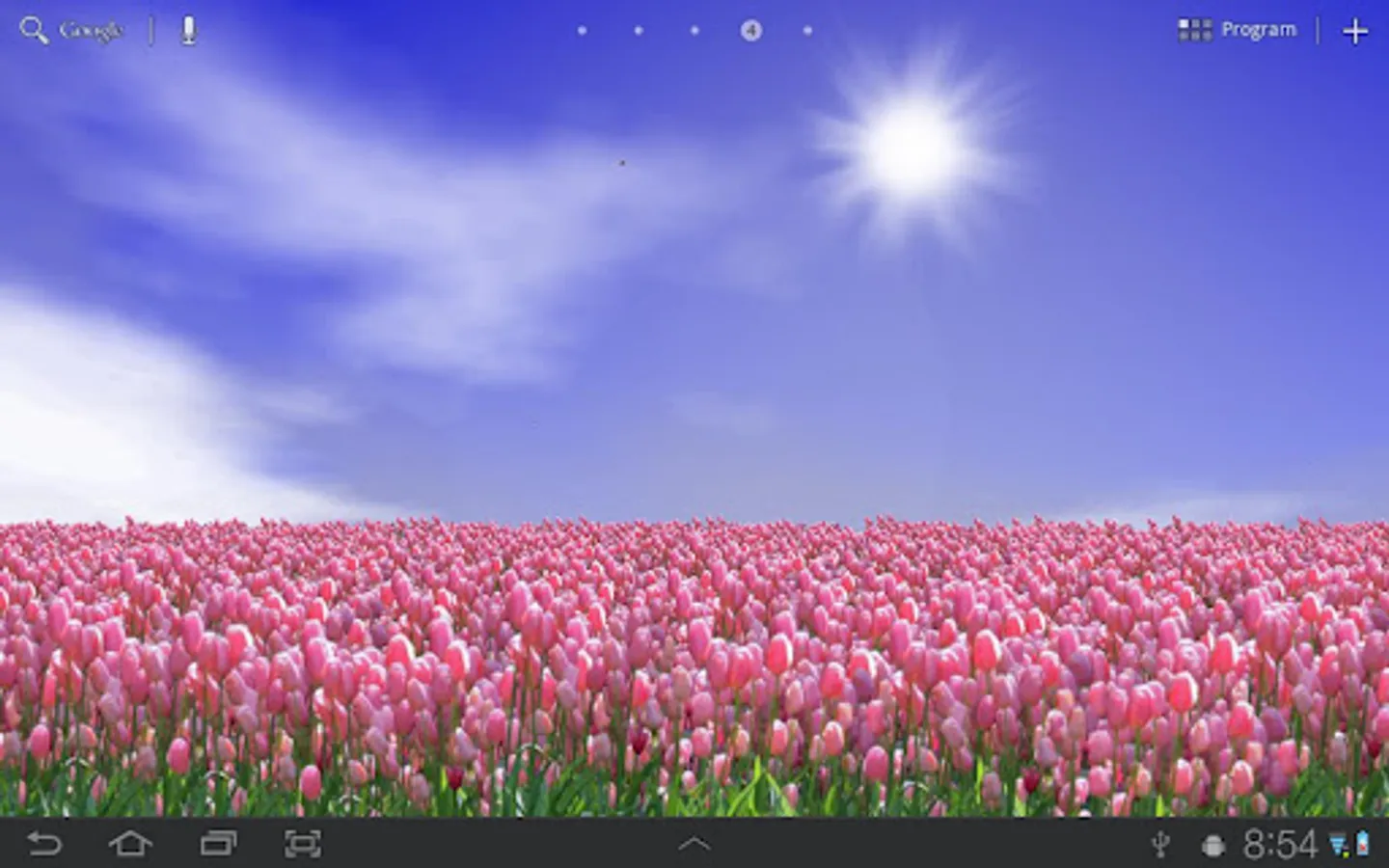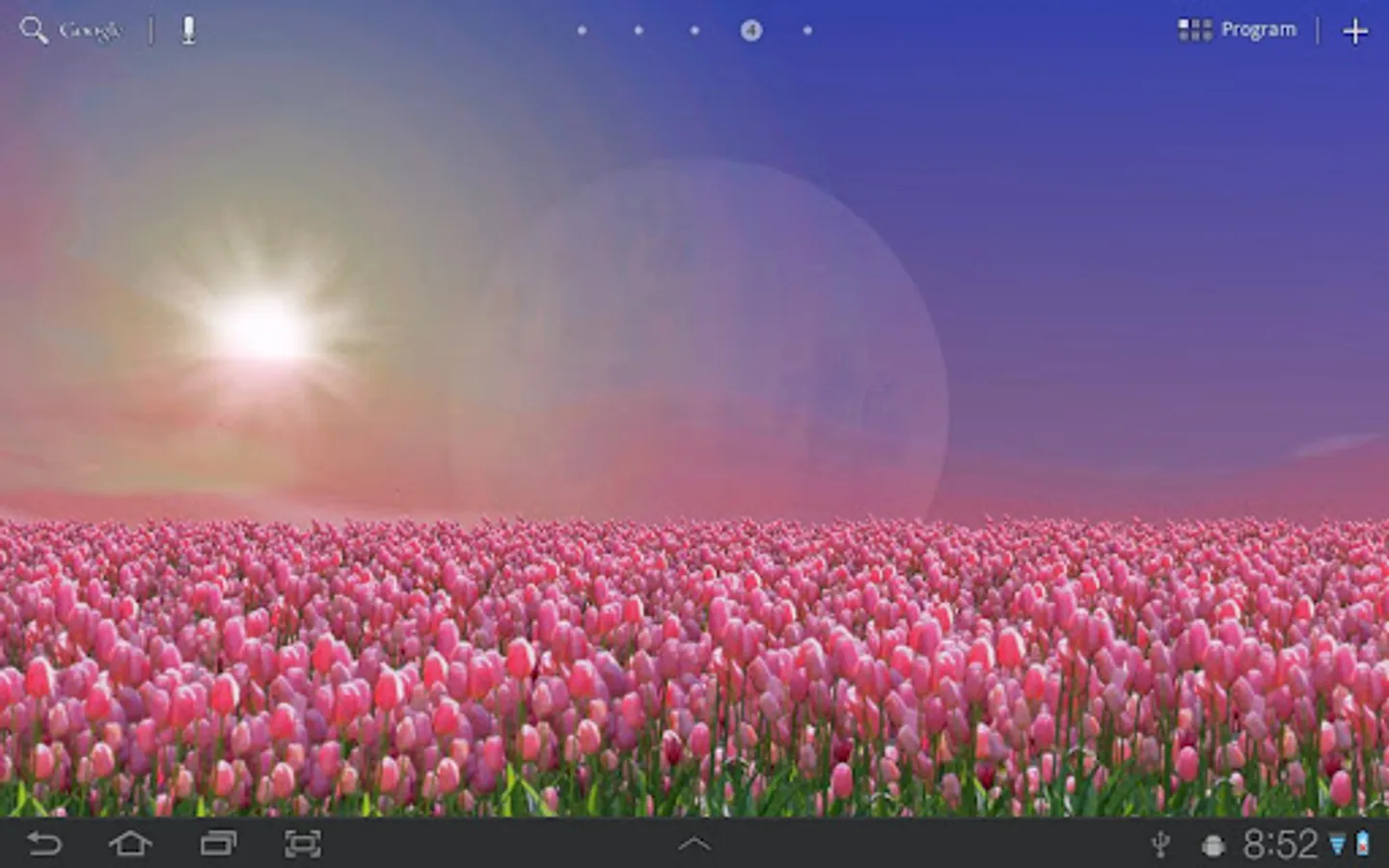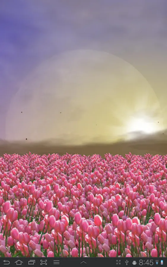 A beautiful tulip field swaying in the wind while a windmill slowly spins in the background. Clouds move over the sky that shifts color dynamically during the day and night. At dawn the sun rises and moves slowly over the sky until sunset around 6 pm. As the night falls the moon appears clearer and clearer until fully visible at midnight.