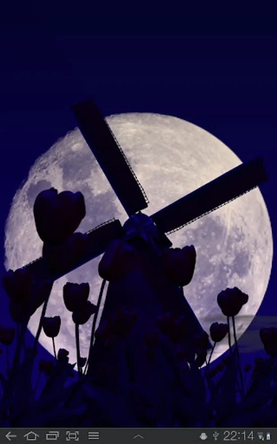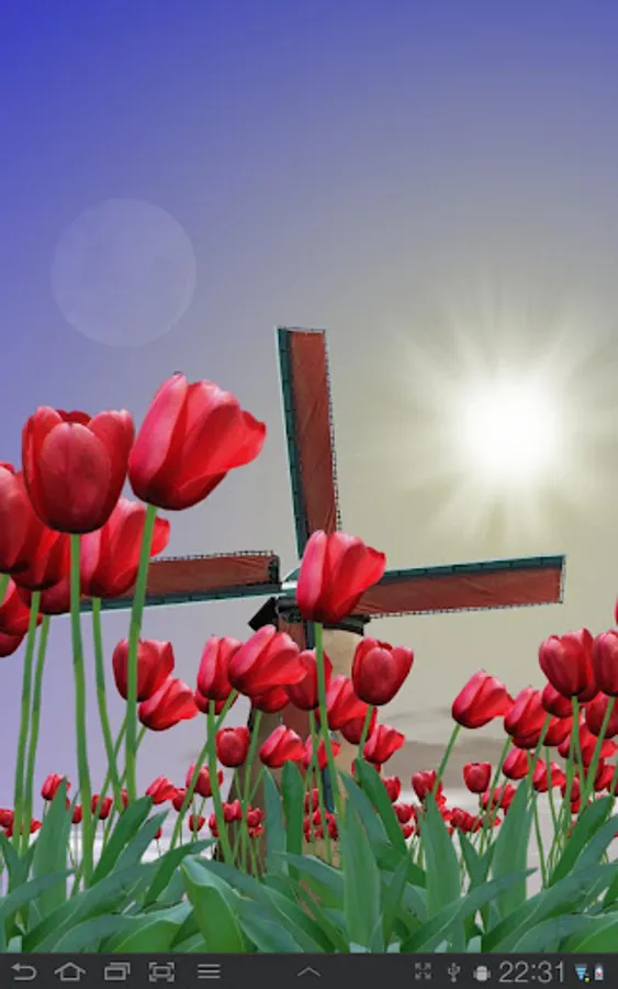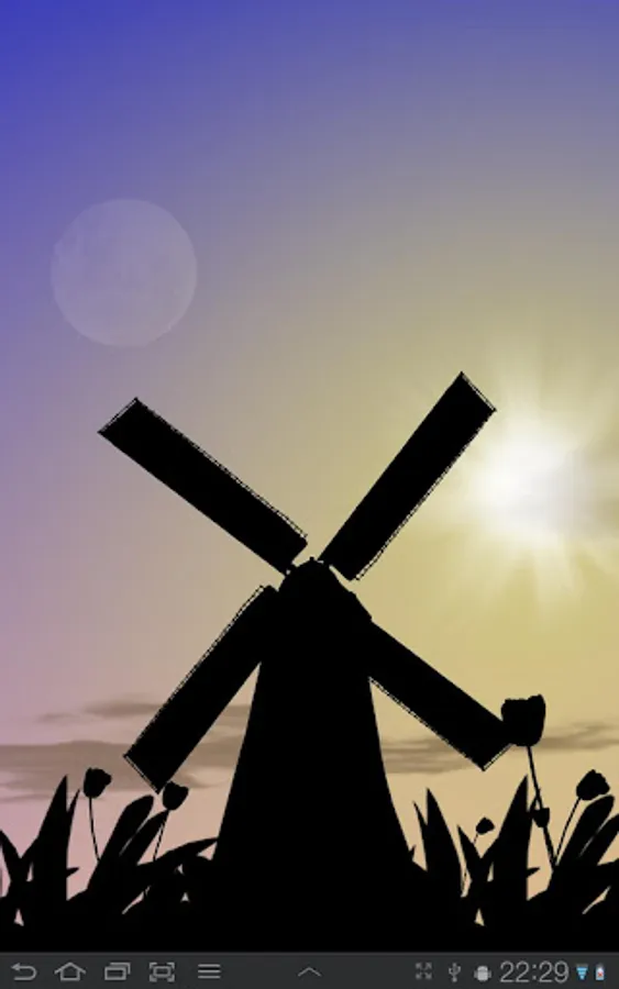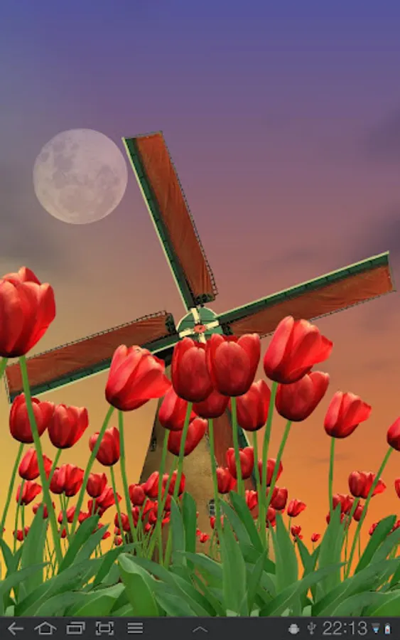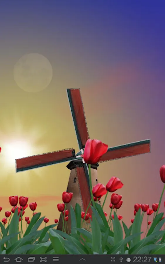 A windmill spinning in the gentle breeze out on a open field with swaying red tulips. Live 24 hour sky with moving clouds, sun, moon and dynamic color shifts according to time. As the day turns to night the moon slowly appears until fully visible at midnight. Full version includes both a dazzling sunrise and a magnificent sunset. And everything in between.