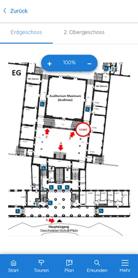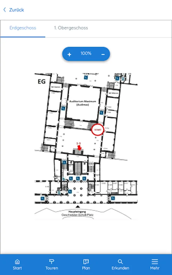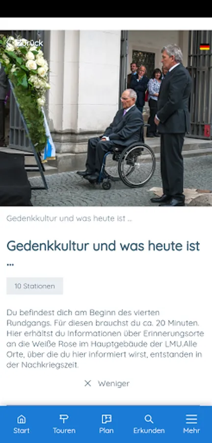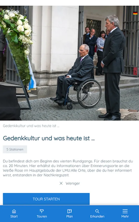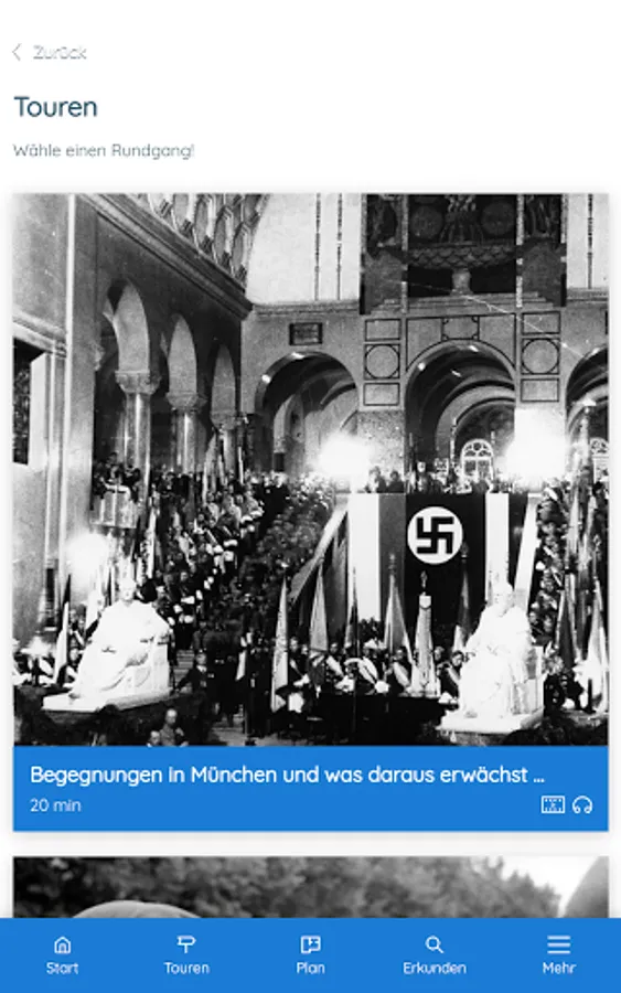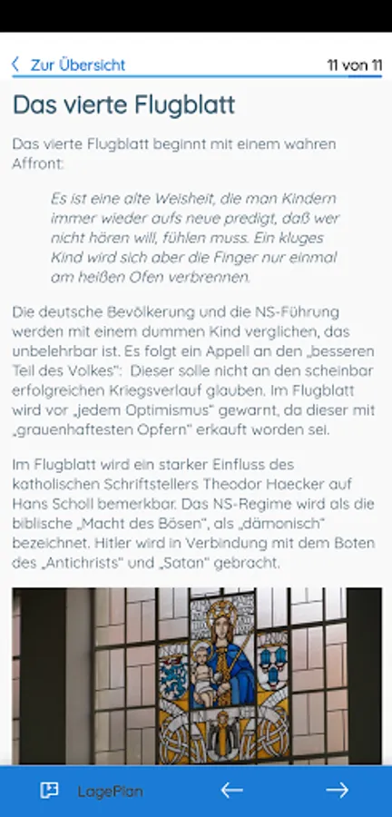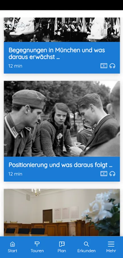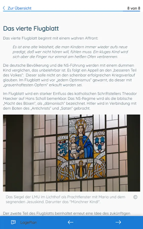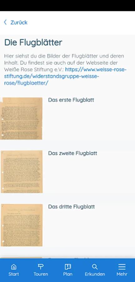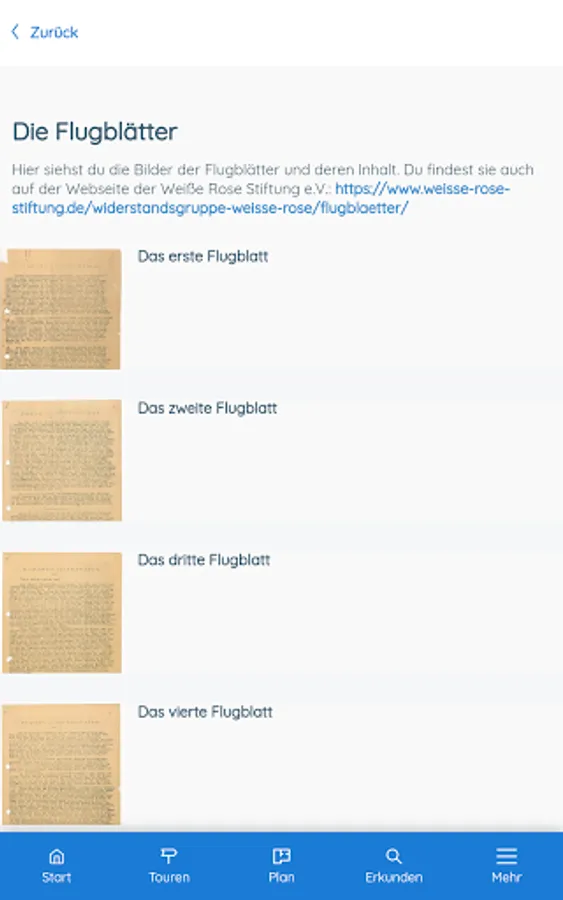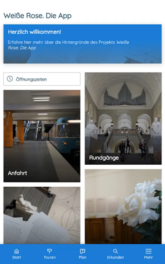 This app offers you didactically and historically processed information about the White Rose. It takes you on four different tours (20 minutes each) through the main building of the Ludwig Maximilians University (LMU). The app is primarily designed for use at the historical location, but can also be used from any other location. You will also be introduced to the White Rose leaflets.