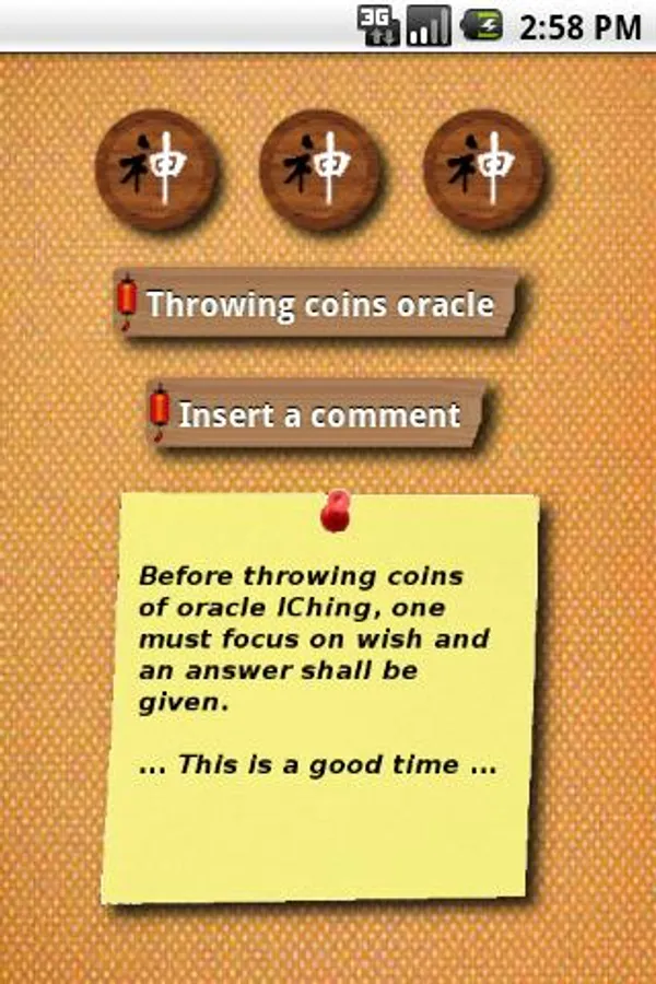 Be advised by iching on your doubts and perplexities, is launching coins oracle and see the details, the ruling and its possible future developments.