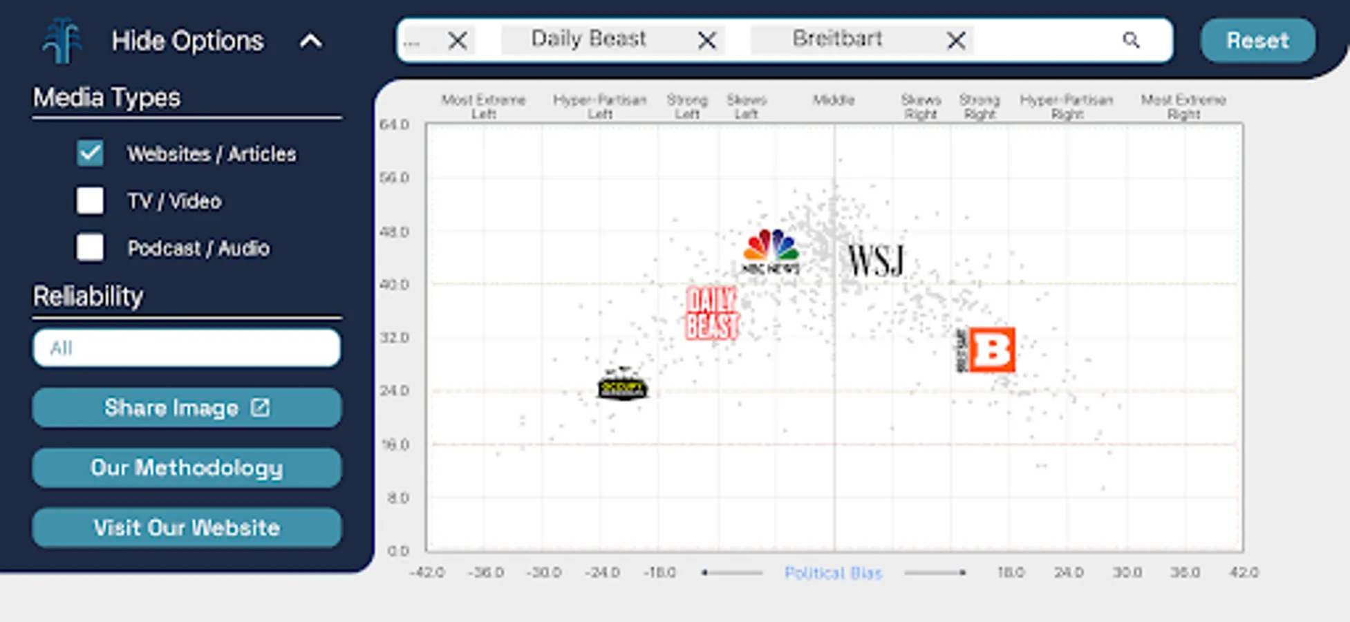 1. Interactive Media Bias Chart: Search thousands of sources including websites, podcasts, and TV shows with an easy-to-use navigation bar. Quickly identify news outlets’ positions, providing a clear overview of their bias and reliability.