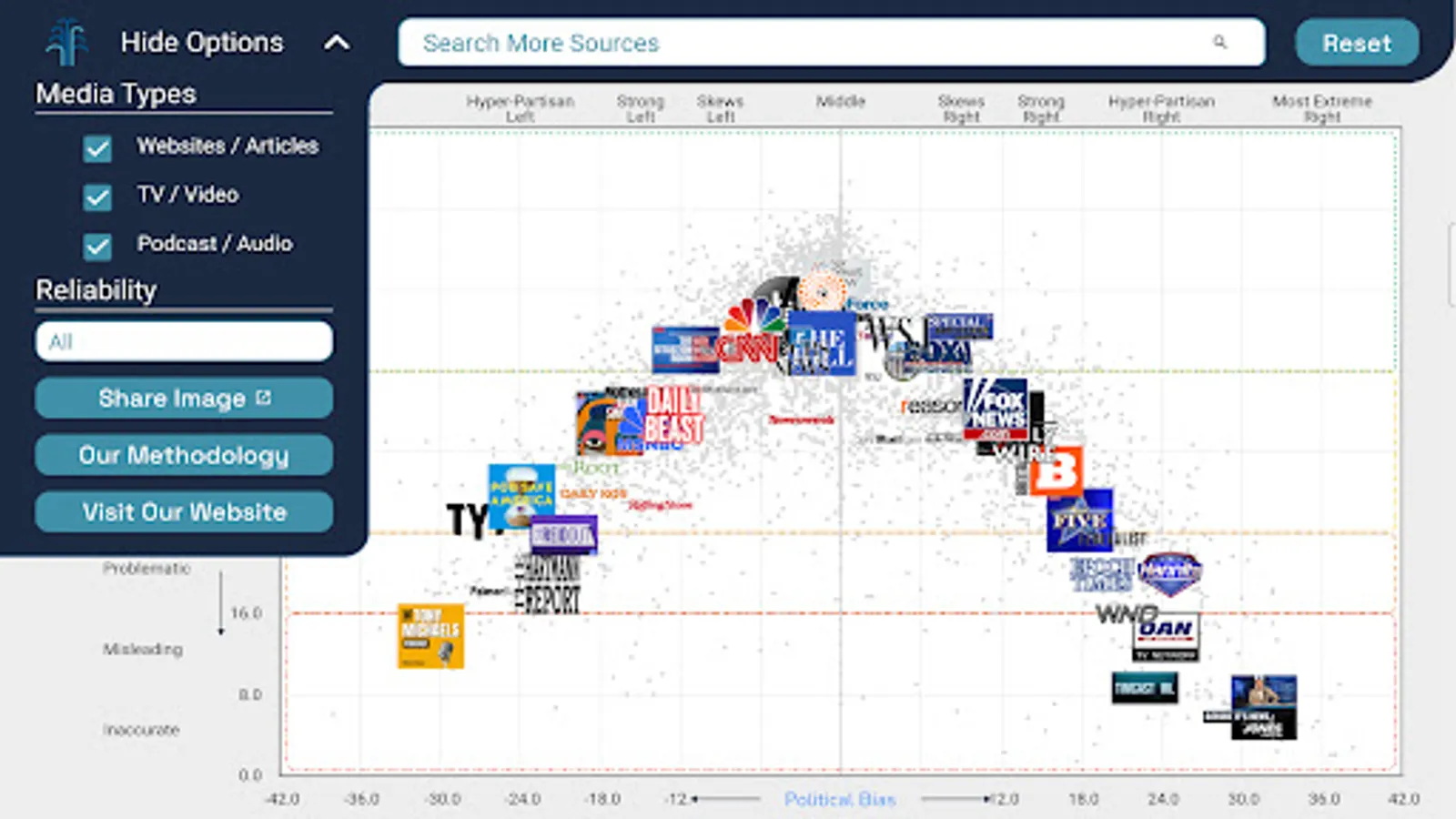 The Media Bias Chart app by Ad Fontes Media helps users gain a deeper understanding of the bias and reliability of news and news-like sources. An intuitive interface presents an extensive collection of news outlets along with their political bias and reliability assessments based on our robust methodology. This app equips users with the knowledge needed to critically evaluate news sources.