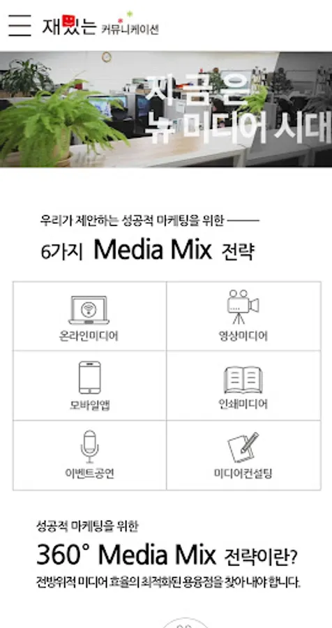 360-degree media mix strategy is a fun communication that finds an optimized melting point of omni-directional media efficiency. A fun communication app helps you understand the media and consult the project.