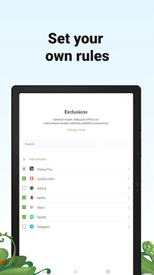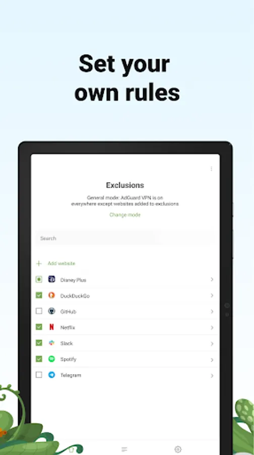 Decide where AdGuard VPN should be on: everywhere except for certain websites or on selected websites only.