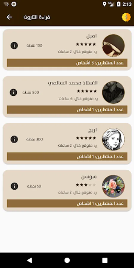 The application includes specialists in the world of constellations and astronomy, reading the cup, reading the palm, reading the face and lines, paper and tarot, emotional and spiritual counseling, and also interpretation of dreams