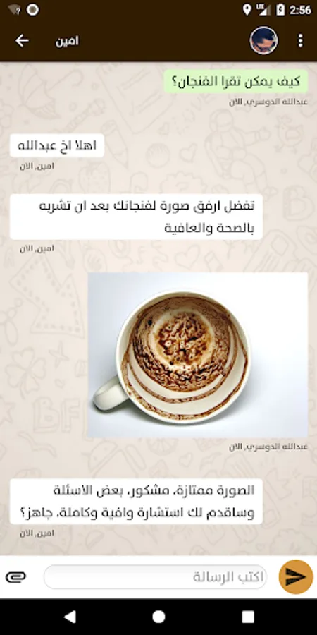 Conversations with experts through a private chat room, including the possibility of sending pictures Kalfjanj palm and others, and the response is very special for everyone who suits him with full privacy.