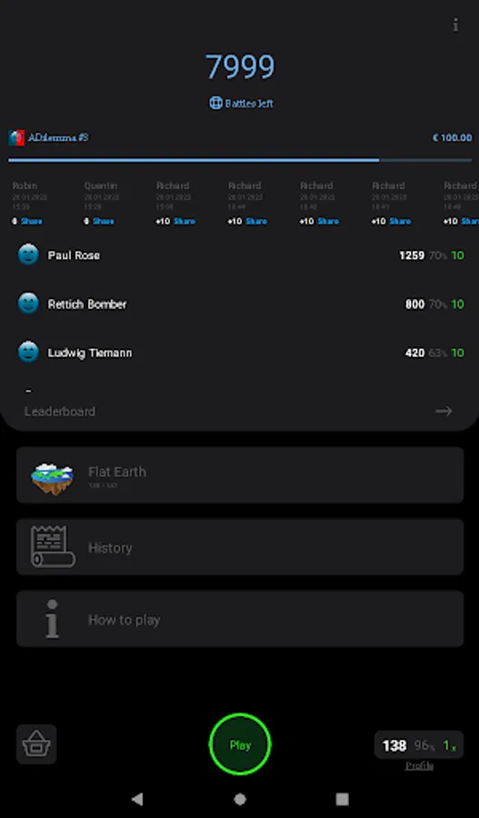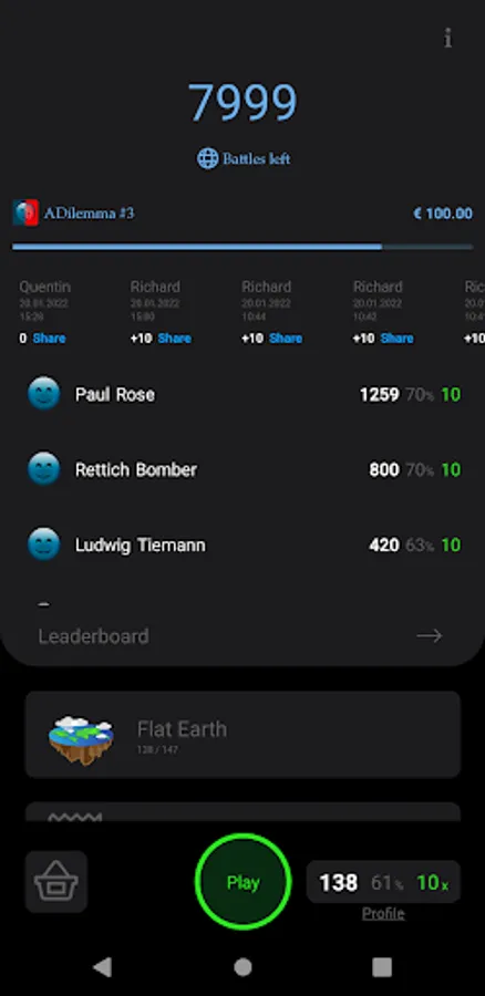 Trust Index: Every decision counts. E.g. in 100 battles you trusted the opponent 80 times, resulting in a Trust Index of 80%. This will be shown in the leaderboard, Final Dilemma and on your profile will not be reset.