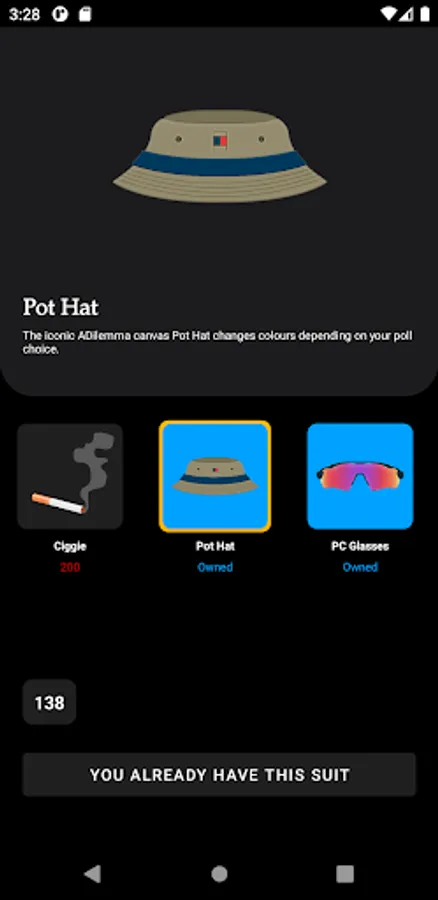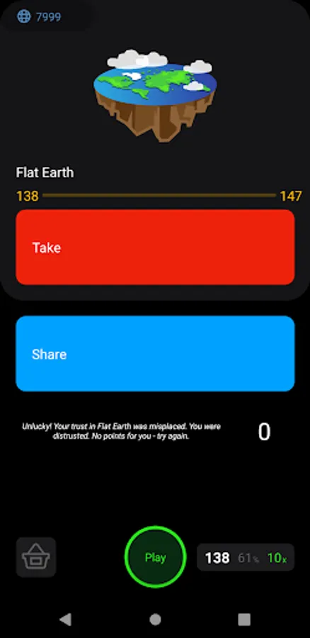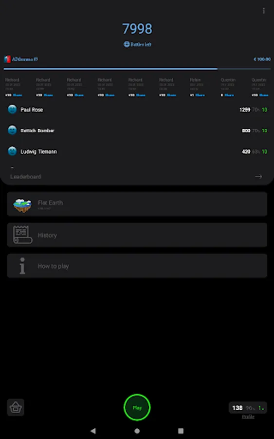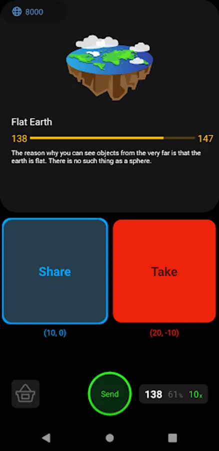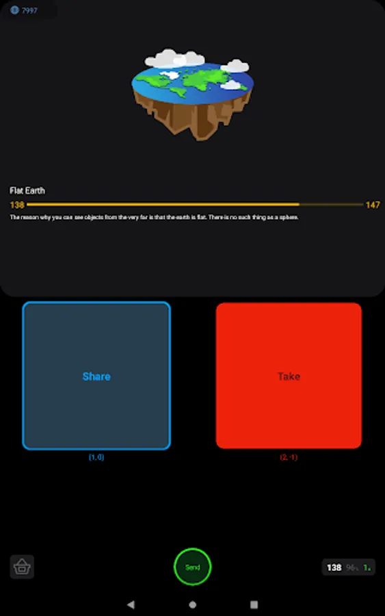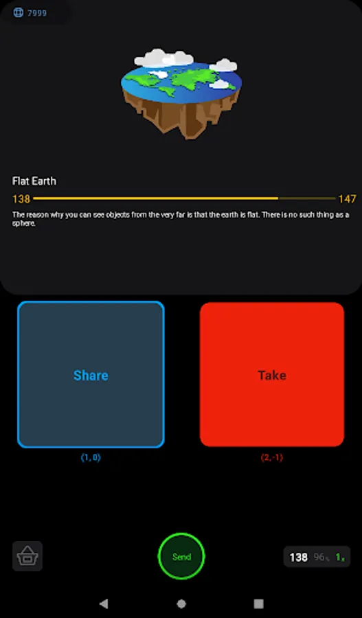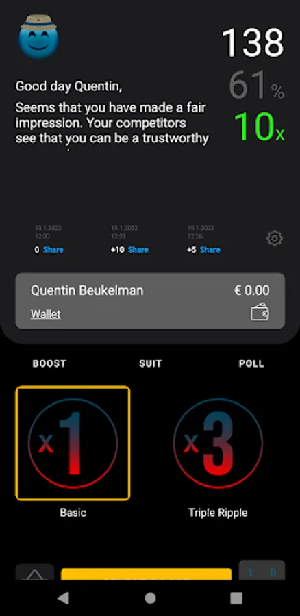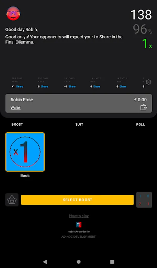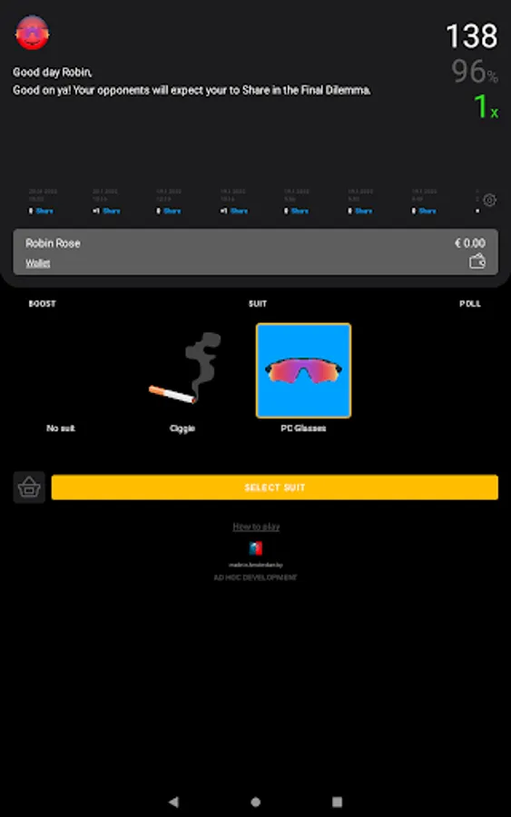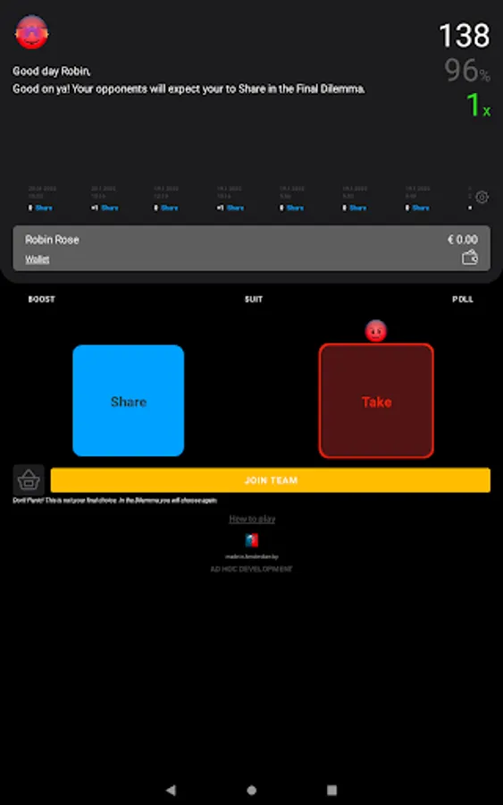 Upgrade profile: In your profile you may participate in a poll, in which you can say what you would do if you were in the Final Dilemma; Share or Take? Throughout each round you can upgrade your profile by spending points on boosts that help you gain points faster to play and discover higher level bots. These will expire by the end of the round. You can also upgrade your profile by getting suits that will decorate your profile. These will stay in your profile indefinitely.