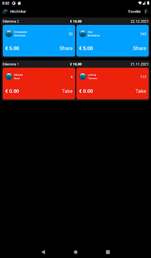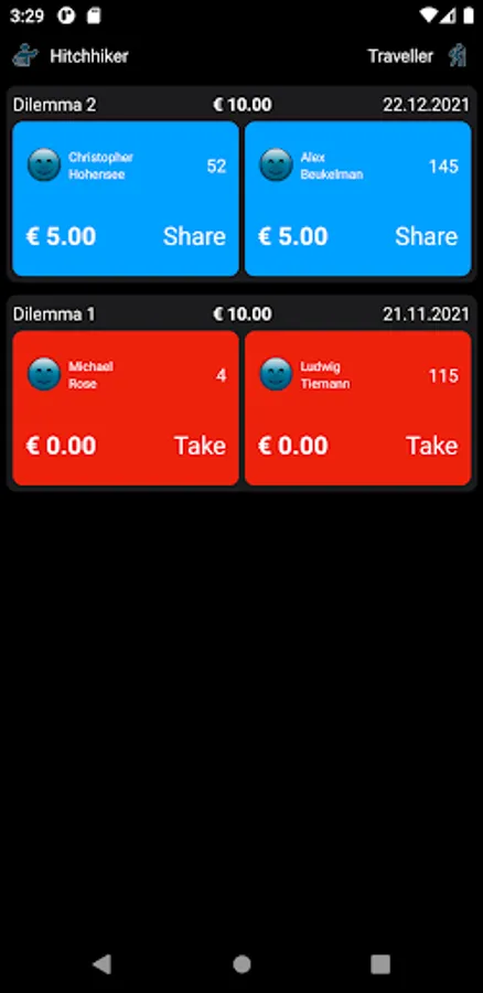 Race to the round final to win the money: Each round two finalists participate in the Final Dilemma. Become one of them by attaining the highest Score in the global leaderboard. To do so, you battle against randomising bots that can trust or betray you. There is a limited number of battles to be played until each round ends and the Final Dilemma begins. This is initiated by clicking on the Endgame button. Whoever clicks this button the fastest (Hitchhiker), joins the Score Leader (Traveller) in the Final Dilemma to play for the round’s prize money.