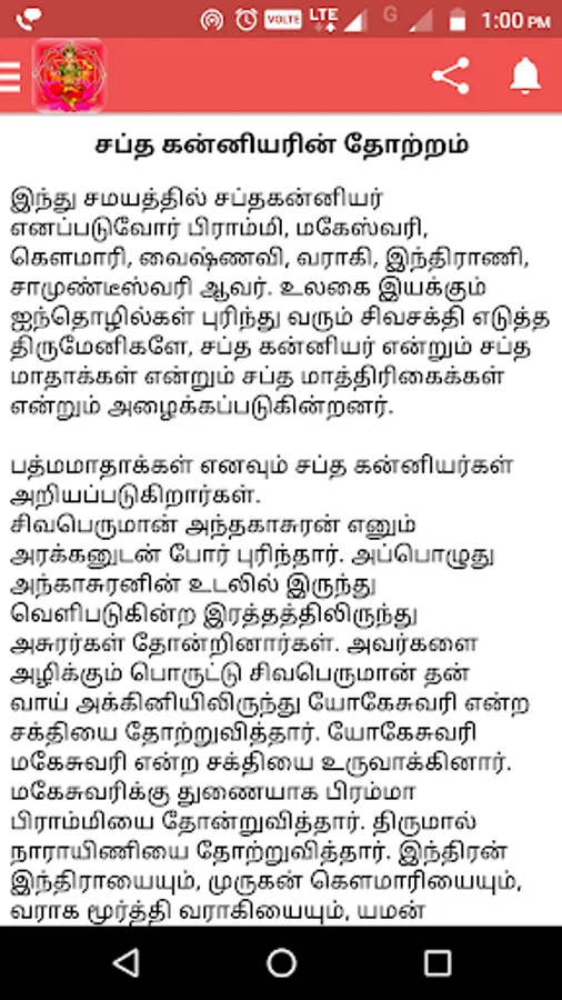 Brahmani emerged from Brahma, Vaishnavi from Vishnu, Maheshvari from Shiva, Indrani from Indra, Kaumari from Skanda, Varahi from Varaha and Chamunda from Devi.