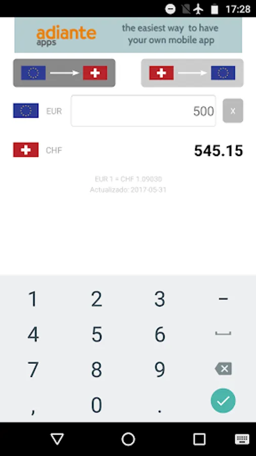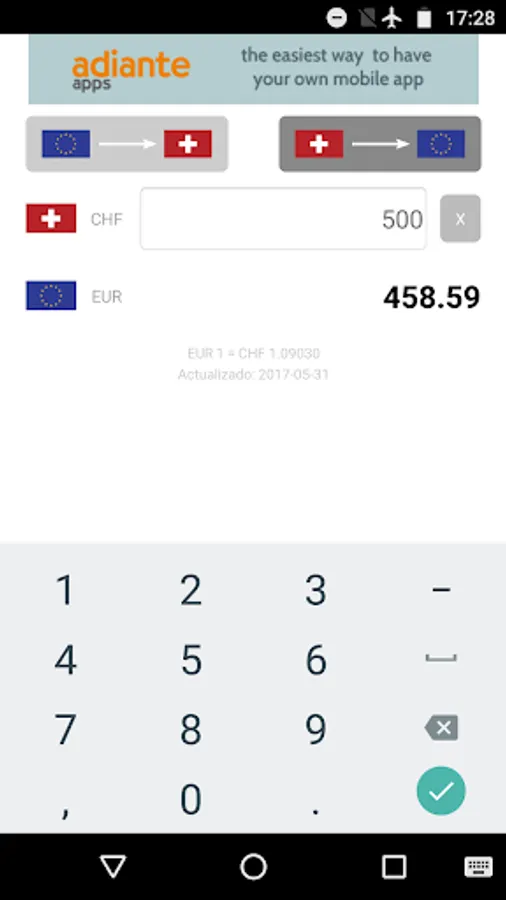Exchange rate is kept updated (do not worry if you do not have Internet, it will use the exchange rate of the last time it was updated).