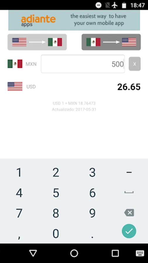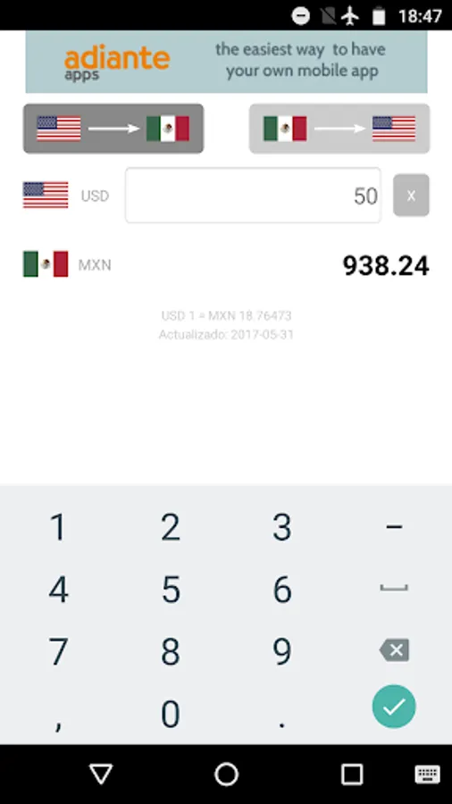 Exchange rate is kept updated (do not worry if you do not have Internet, it will use the exchange rate of the last time it was updated).