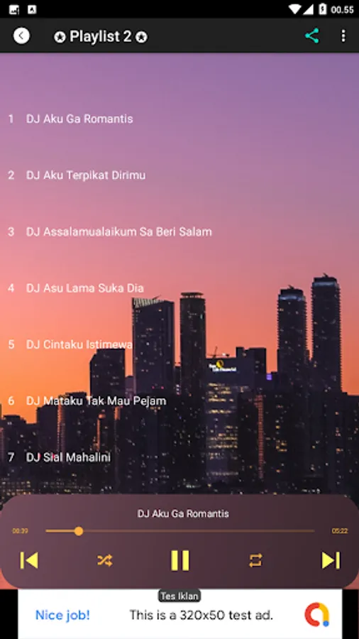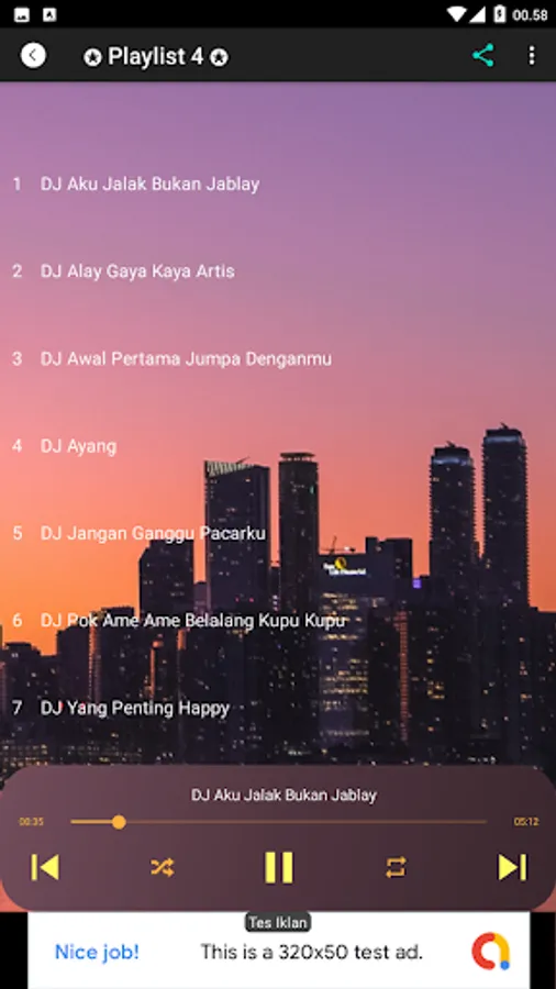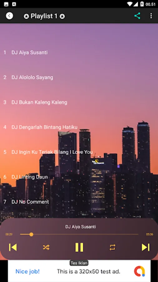 This application is an offline application, which contains 28 mp3 DJ Remix songs, one of which is DJ Aisya Susanti Remix's song, which is in playlist 1.