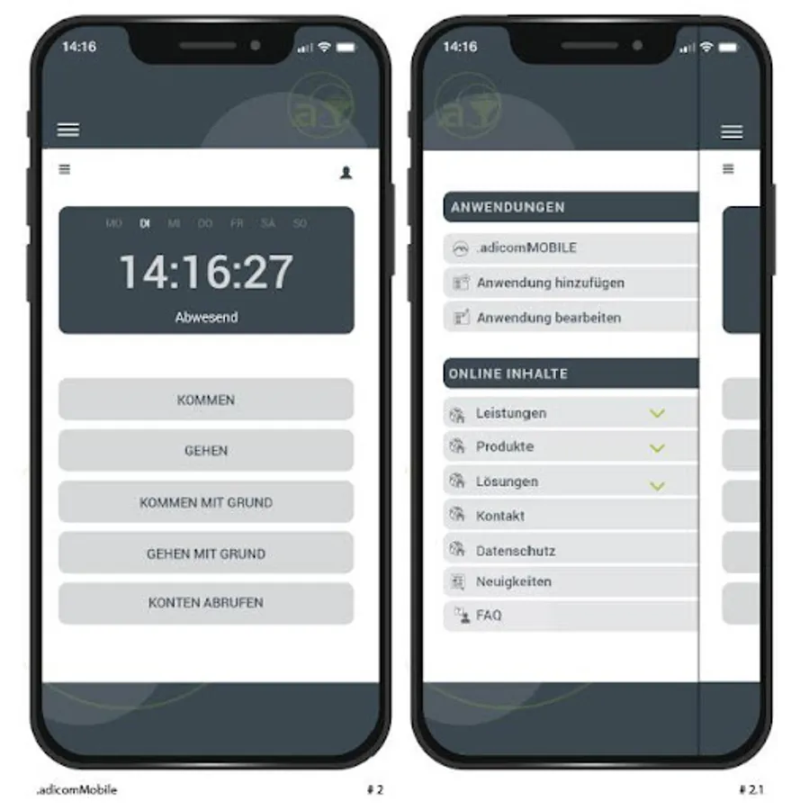 With this app, you have the option of recording your working hours such as COMING, GOING, business trips and absence bookings with mobile devices on the basis of Adicom personnel time management. Furthermore, time account and vacation status can be called up.