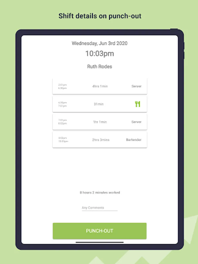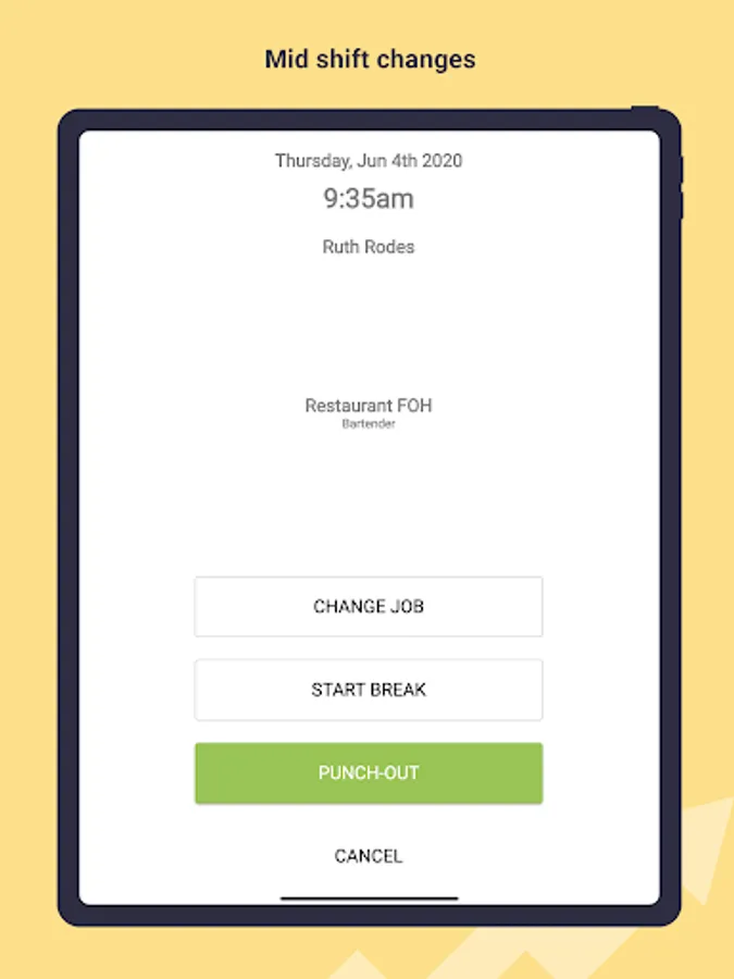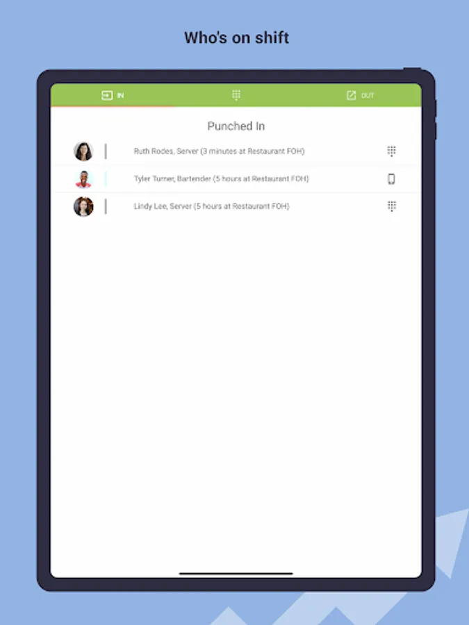 Punch-in & out syncs with Adi phone app, so managers can see who is on shift on the fly from anywhere, and staff can see their time worked information.