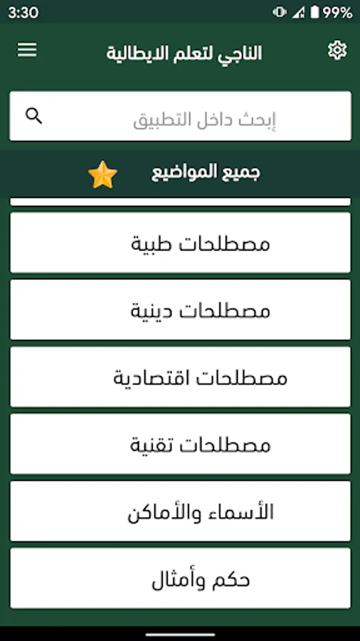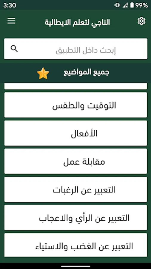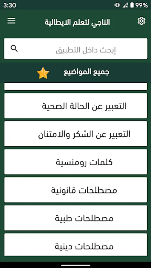 1. Various Lessons: The app offers a variety of step-by-step lessons, from basic to advanced levels. The lessons cover different topics such as: Italian vocabulary, Italian words, and Italian phrases.