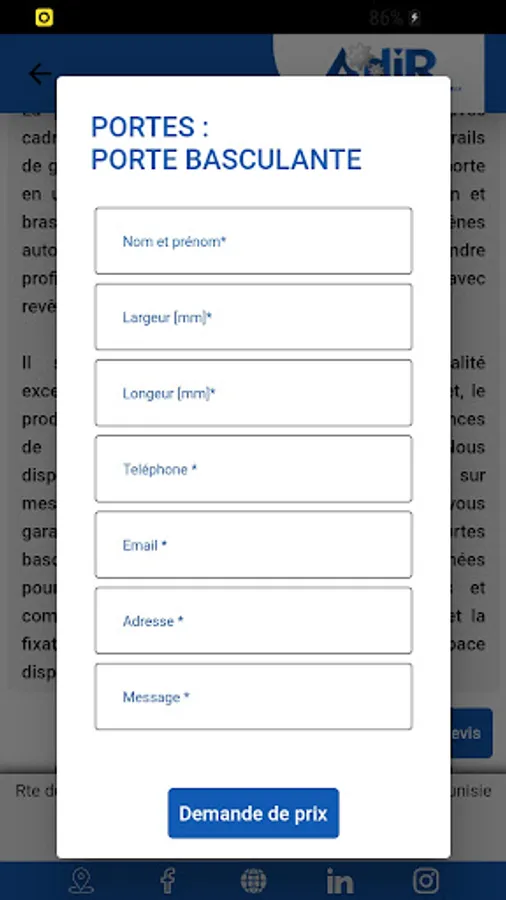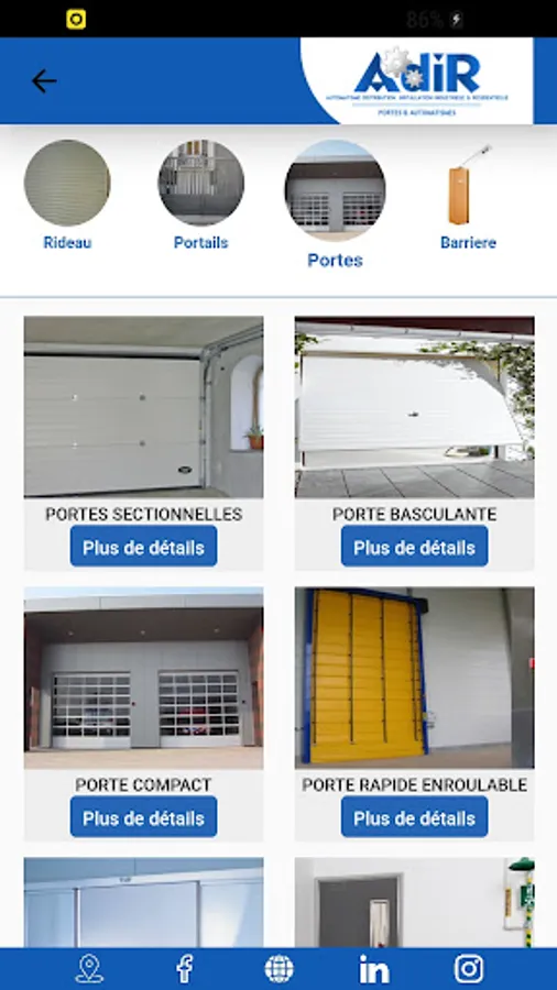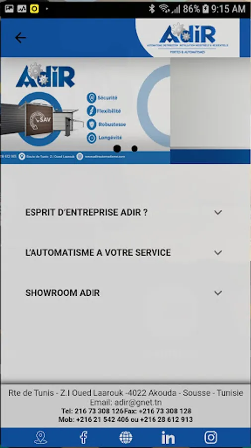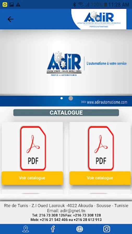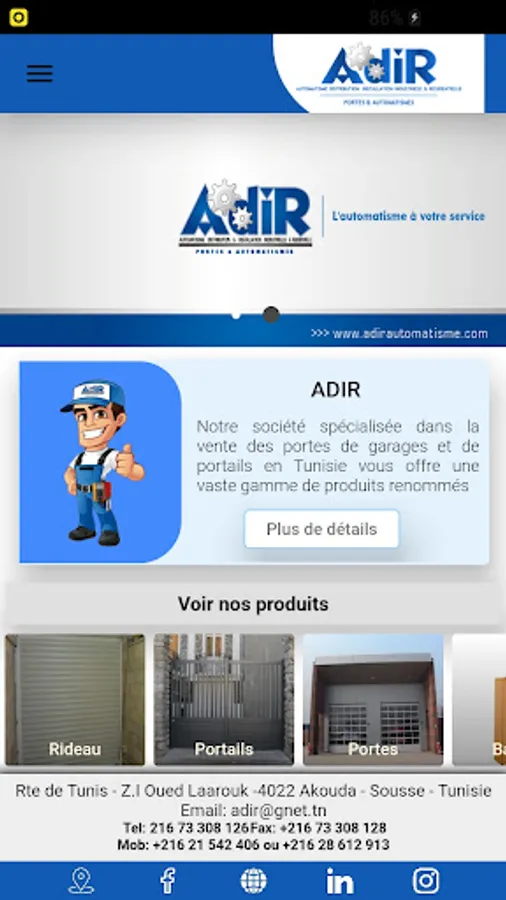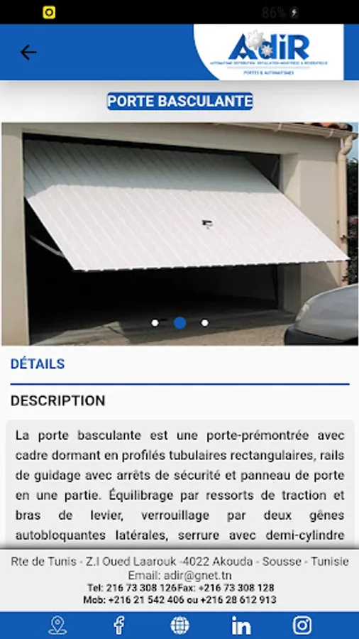 e solutions pour vos installations industrielles et résidentielles. Associée à des leaders dans le marché européen, notre société Adir implantée en Tunisie vous propose d’opter pour la qualité sans pour autant négliger le prix. En effet, notre entreprise vous invite à découvrir les multiples gammes de portails et de portes à usage résidentiel et industriel en plusieurs dimensions, formes et coloris tout en privilégiant le rapport qualité-prix. Plusieurs types de motorisation adaptés à votre style de portail ou de porte de garage sont aussi disponibles. Du classique au plus moderne, vous en aurez pour tous les goûts. Nous vous proposons également différents types de matériaux à savoir : le PVC, l’aluminium, acier galvanisé, etc. pour une meilleure qualité. Qu’il soit professionnel, résidentiel ou industriel, le produit que nous vous