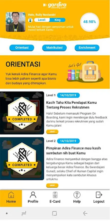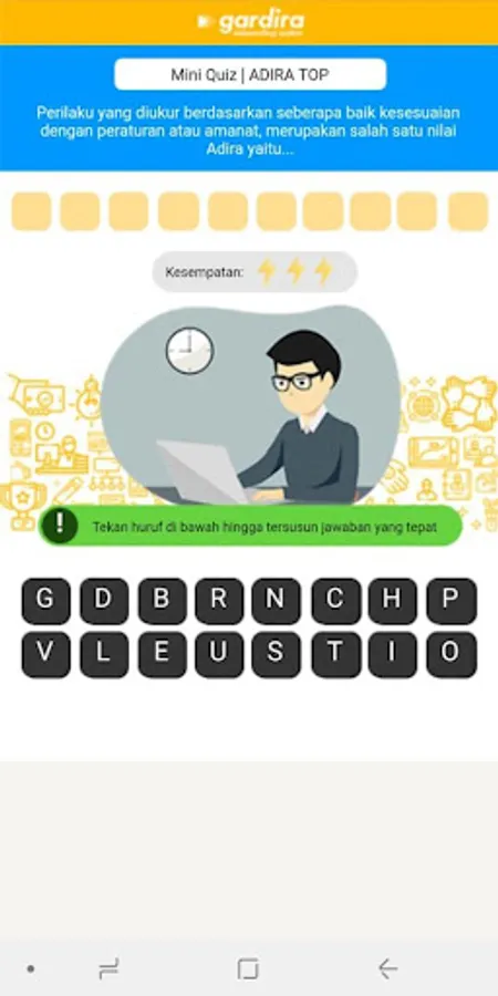 Aplikasi yang digunakan untuk mempersiapkan karyawan baru dalam memasuki dunia kerja di Adira Finance. Melalui Gboard karyawan baru bisa mempelajari lebih jauh mengenai perusahaan hingga hal-hal penting seputar pekerjaannya masing-masing. Seluruh knowledge tersebut dikemas dalam suatu rangkaian aktivitas dan kegiatan yang harus dilakukan beriringan dengan perjalanan karyawan tersebut, mulai dari tahap awal sebelum masuk hingga 12 hari kerja pertamanya.